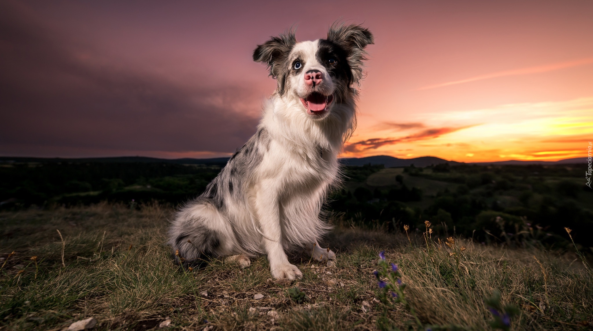 Edytor tapety: Border collie w trawie o zachodzie słońca
