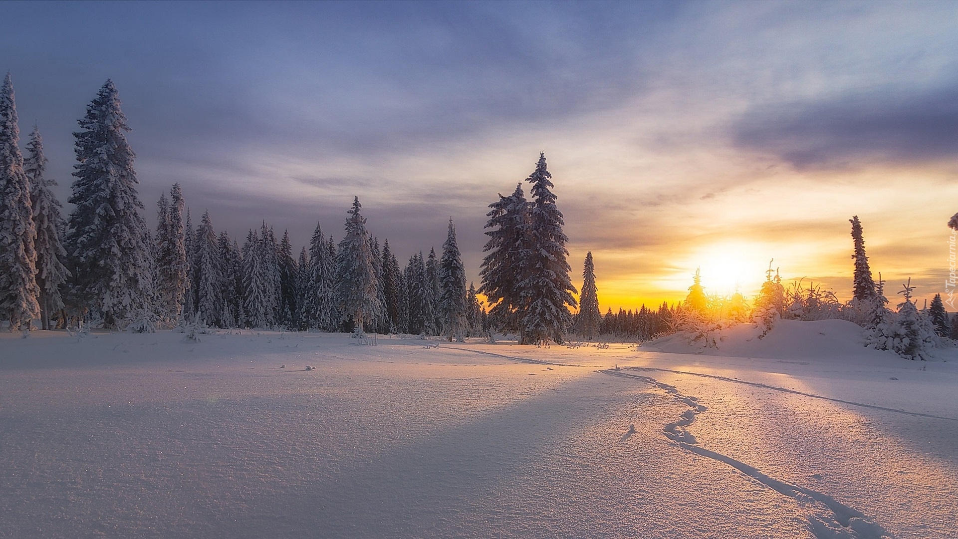 Edytor tapety: Ślady na śniegu w promieniach słońca