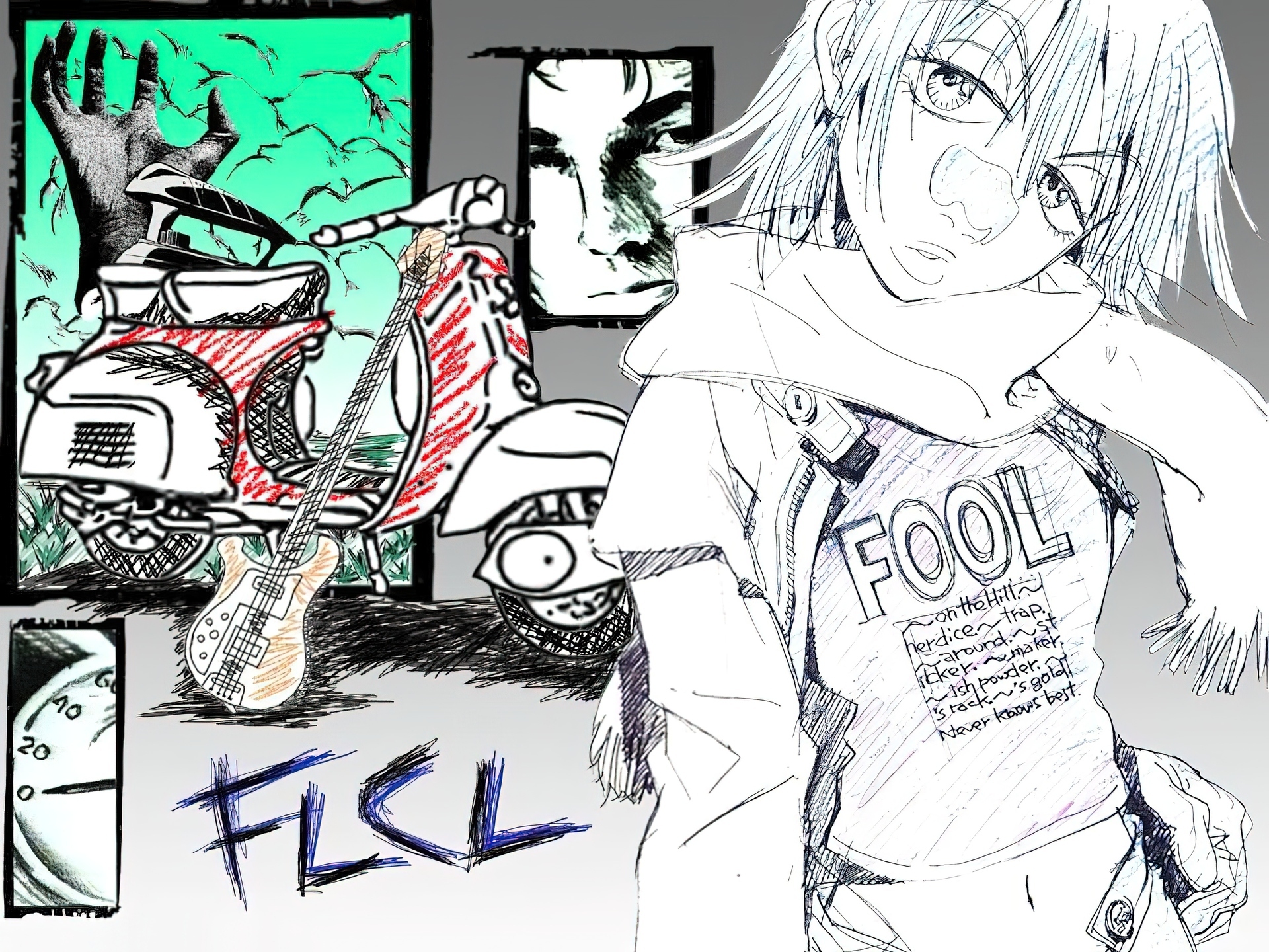 Edytor tapety: Fully Coolly, rysunek, komiks, postać, skuter, gitara
