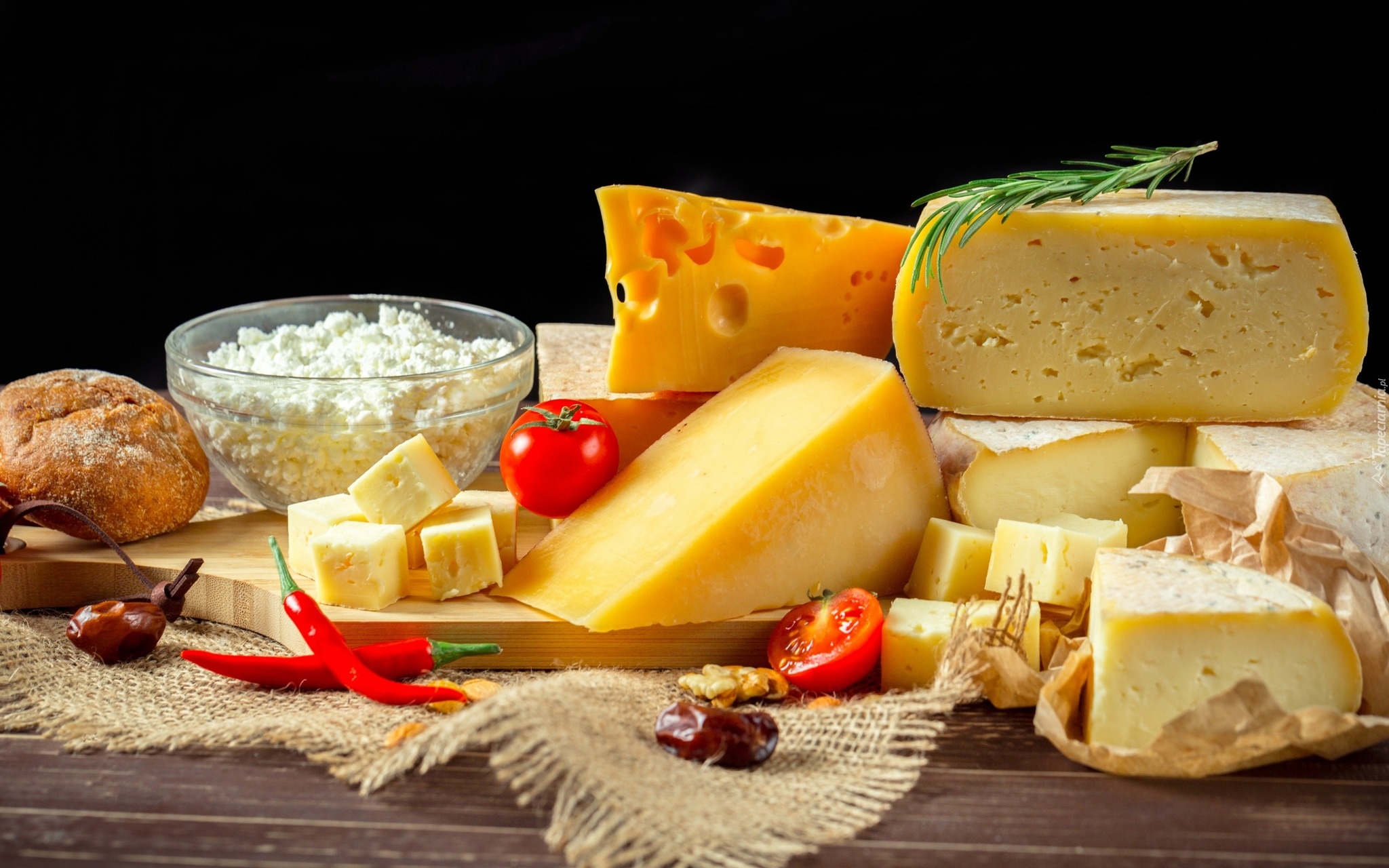 Edytor tapety: Różne rodzaje serów z papryką, pomidorem i chlebem