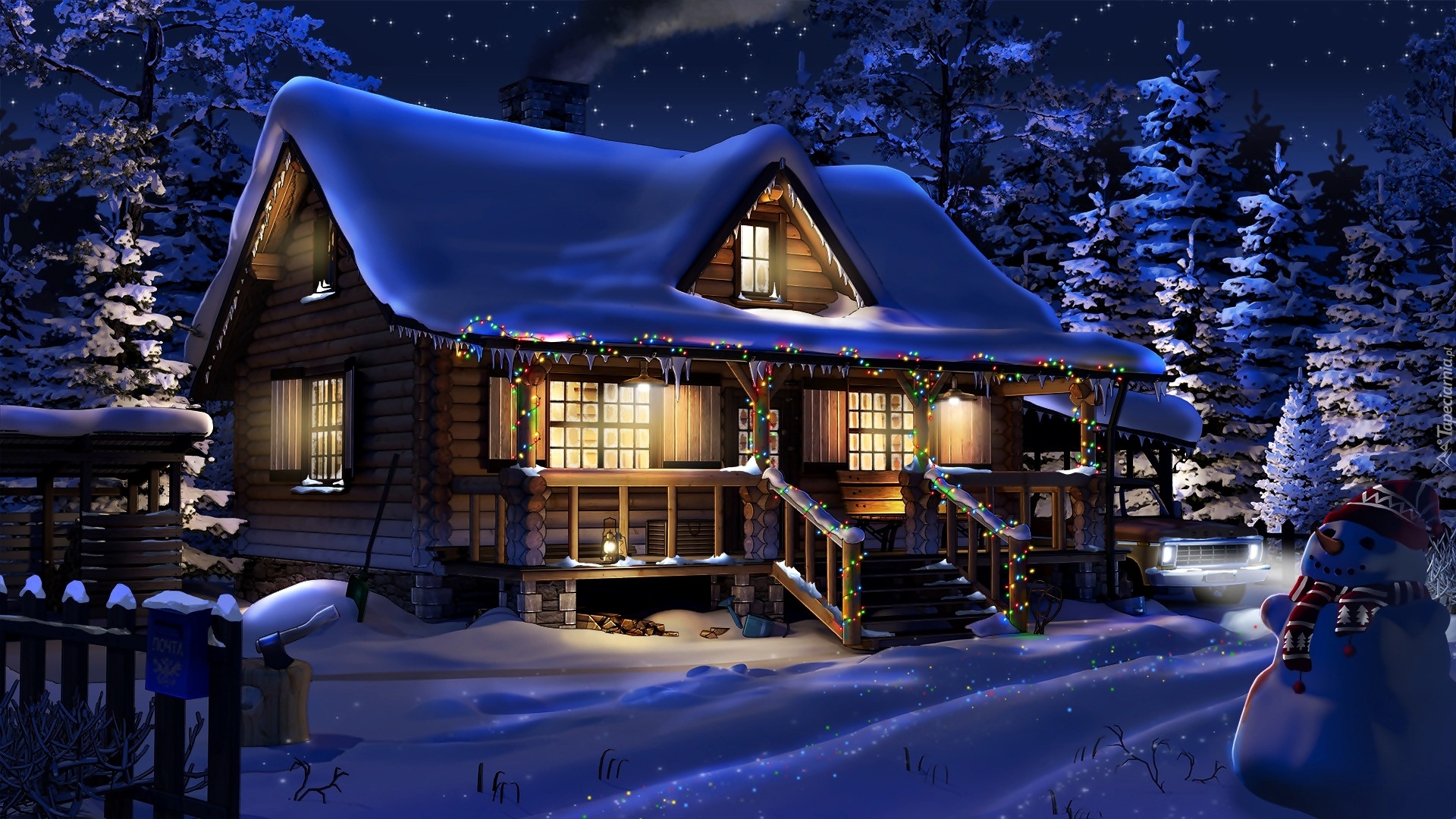 Edytor tapety: Ośnieżony dom przystrojony na święta