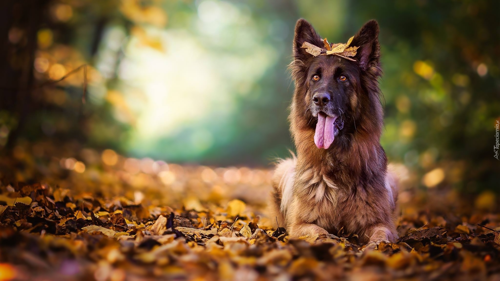 Edytor tapety: Owczarek niemiecki z liśćmi na głowie
