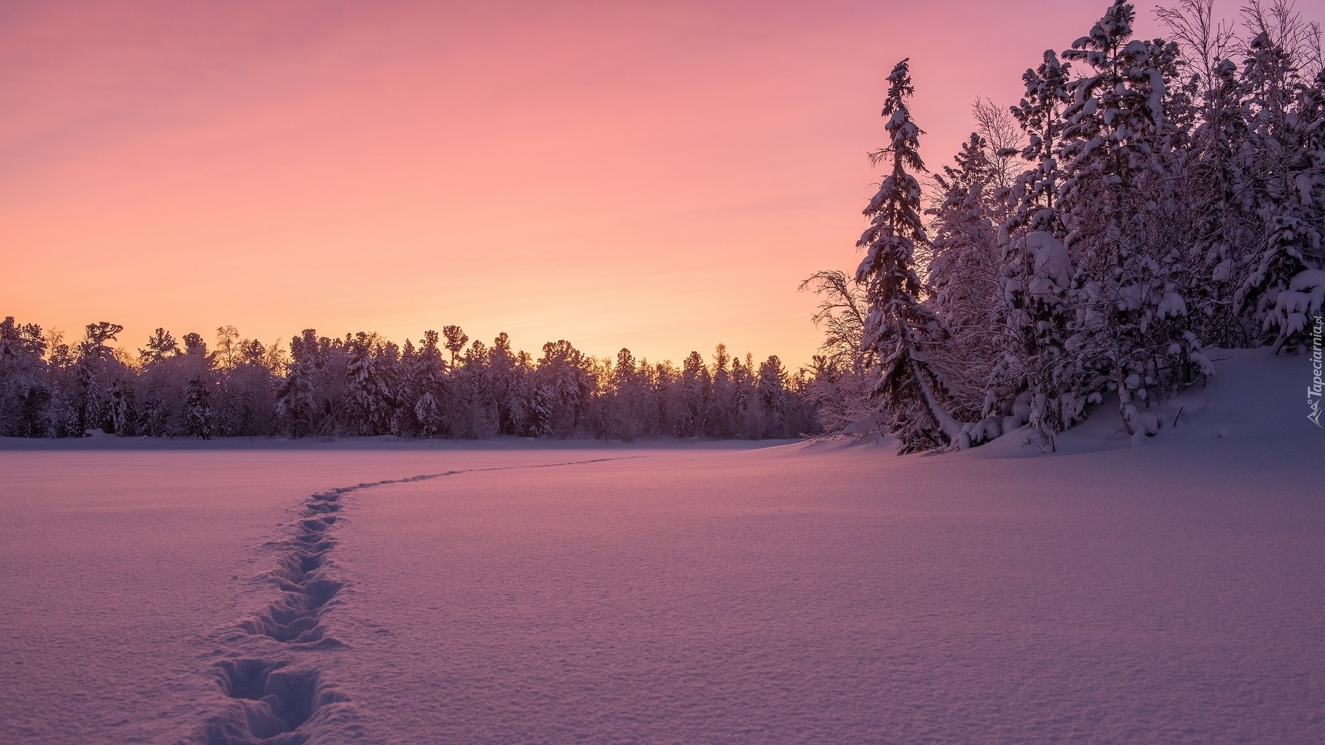 Edytor tapety: Ślady na śniegu obok ośnieżonych drzew