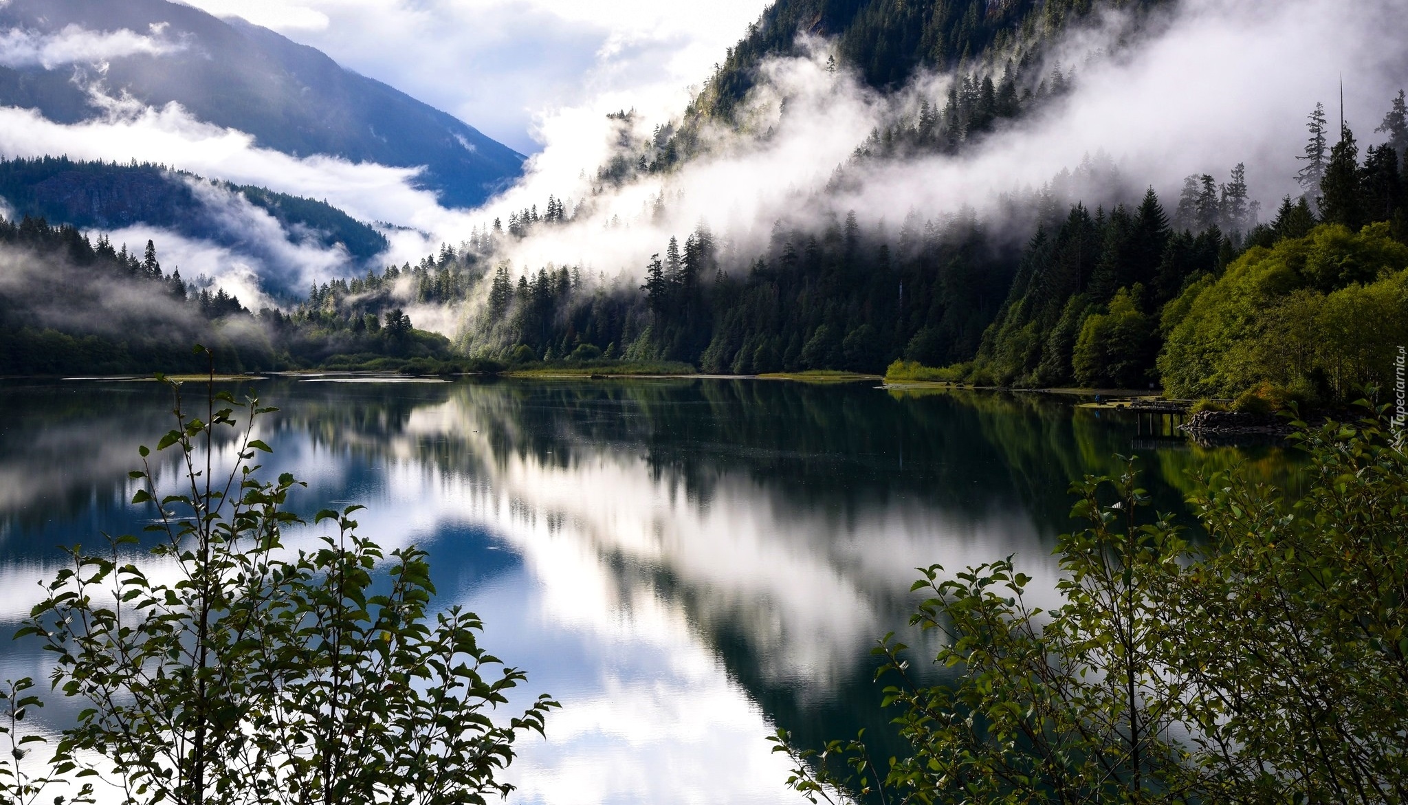Edytor tapety: Góry we mgle nad jeziorem