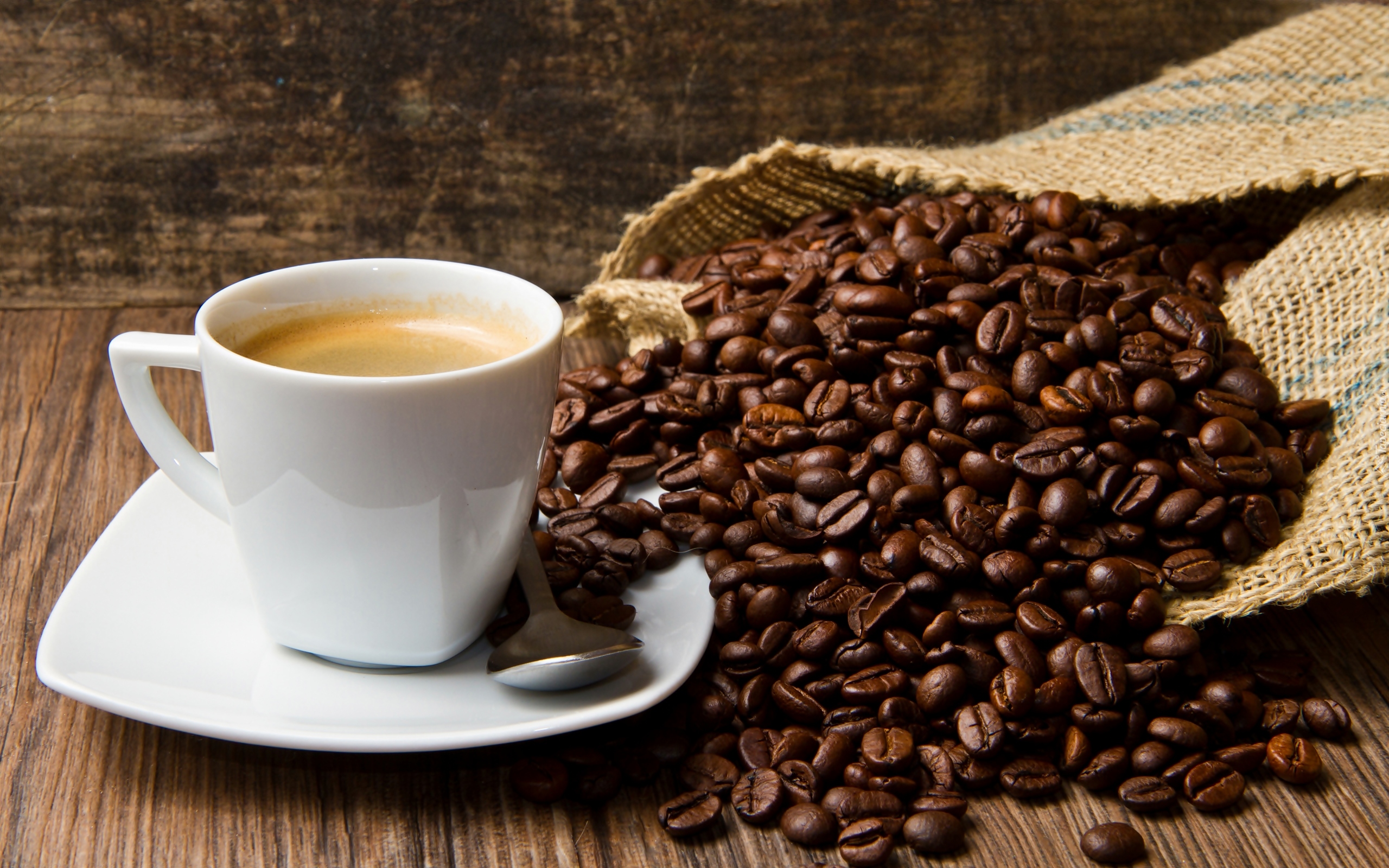 Edytor tapety: Filiżanka kawy przy worku z ziarnami