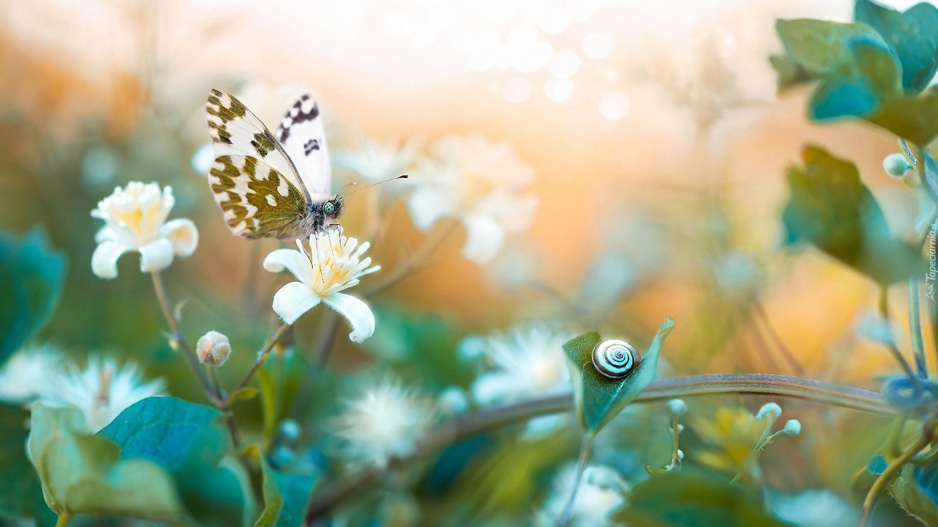 Edytor tapety: Bielinek rukiewnik na kwiatku i ślimak na liściu