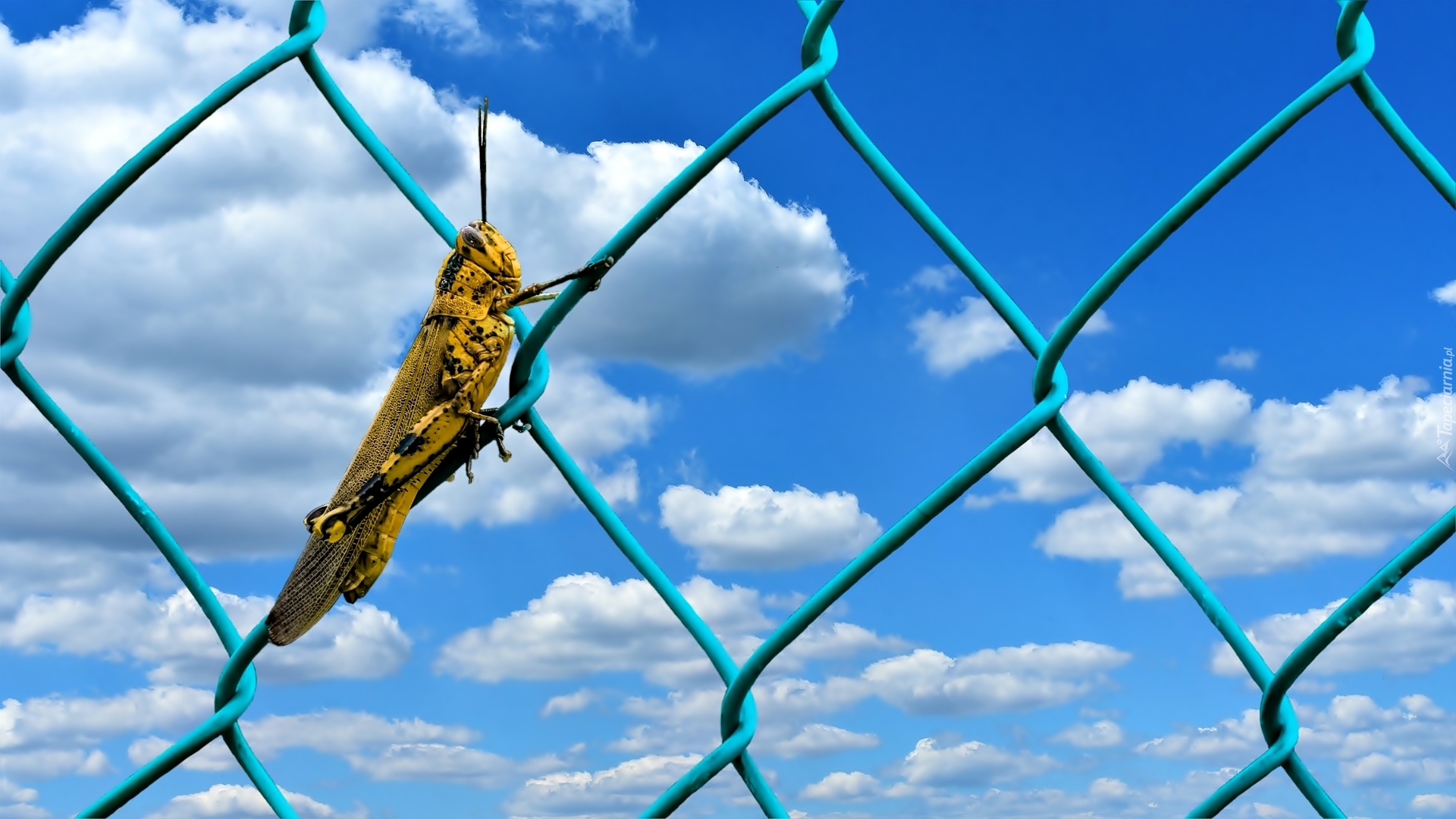 Edytor tapety: Konik polny na ogrodzeniu z chmurami w tle