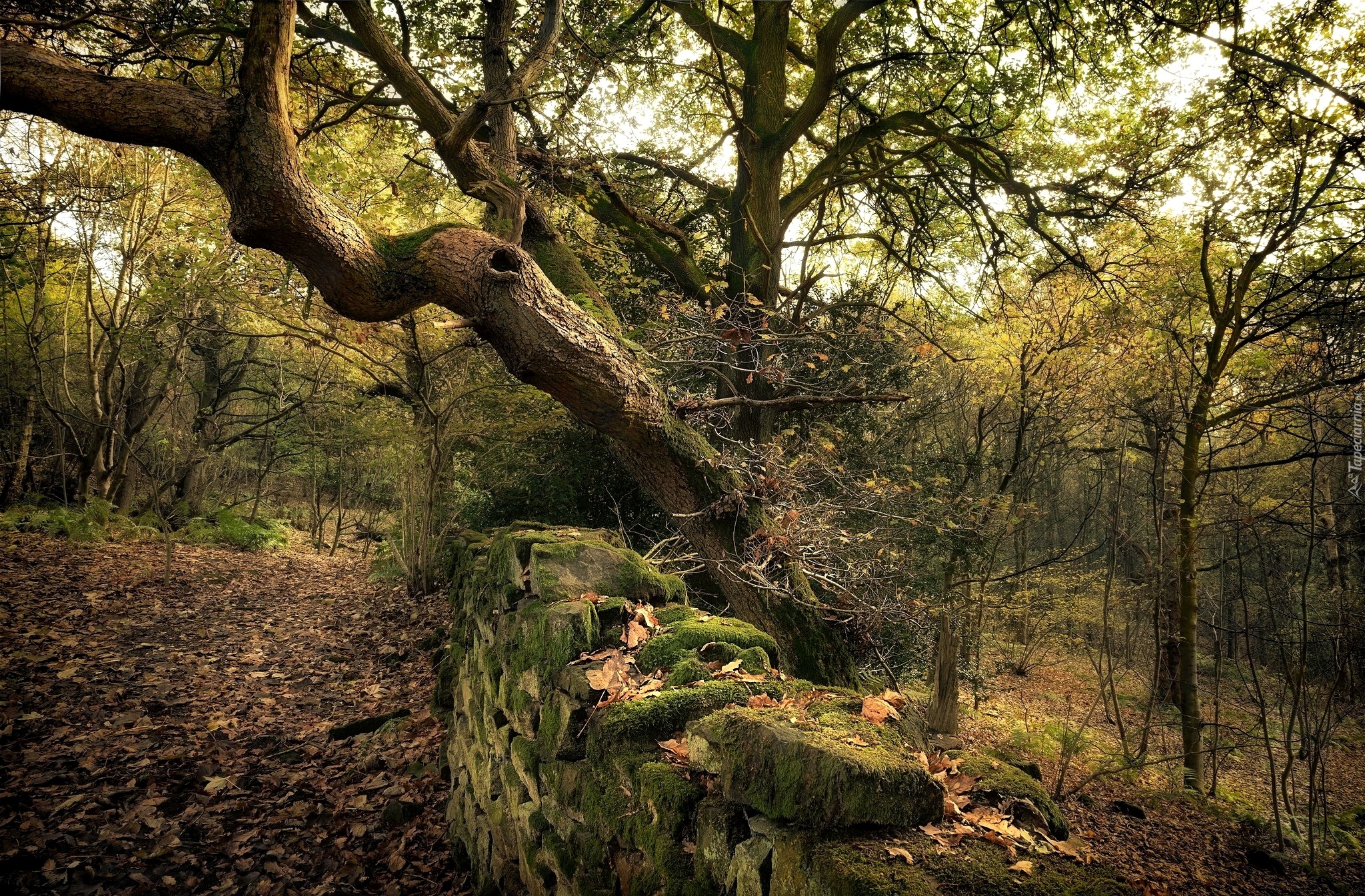 Edytor tapety: Przydrożne drzewo i murek z omszałych kamieni