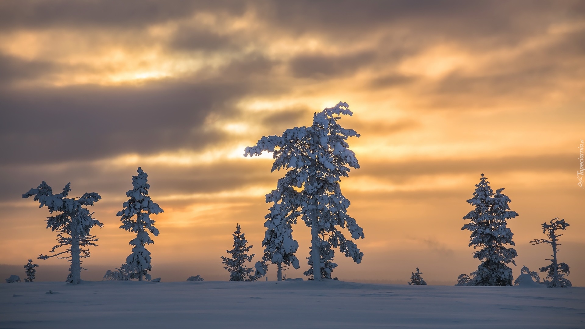 Edytor tapety: Zachód słońca i ośnieżone drzewa