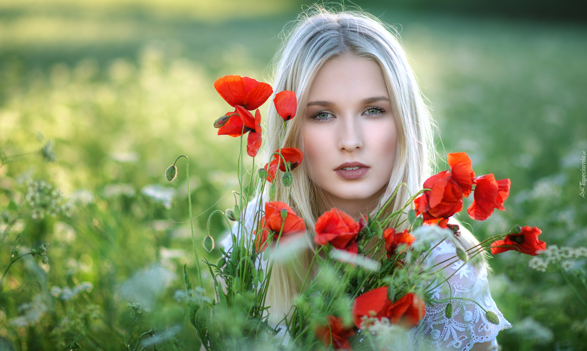 Edytor tapety: Blondynka na łące pośród maków