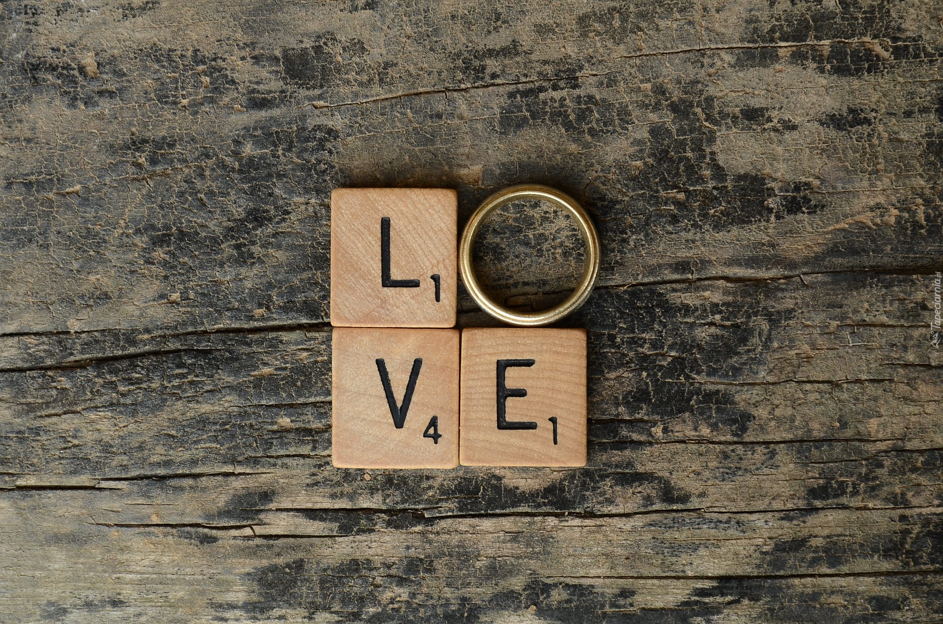 Edytor tapety: Płytki scrabble i obrączka tworzące słowo love