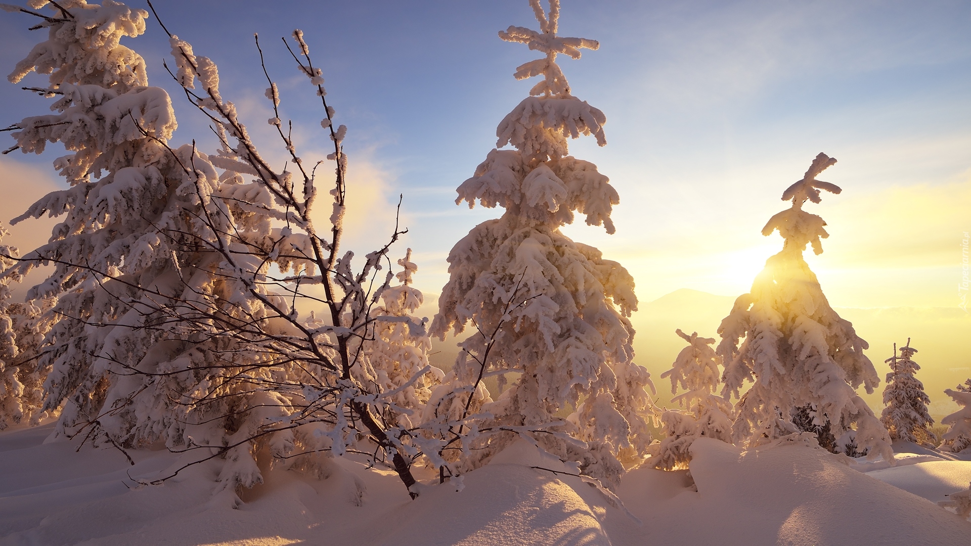 Edytor tapety: Ośnieżone świerki w blasku zachodzącego słońca