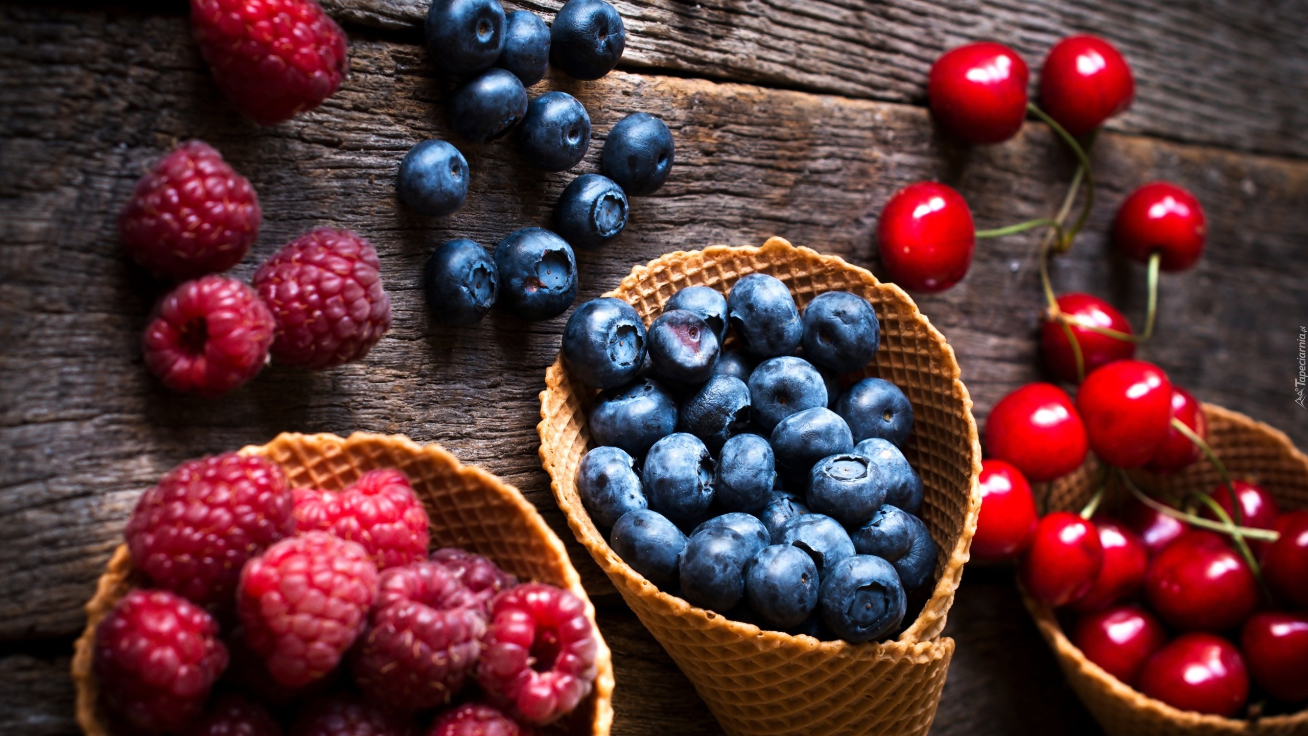 Edytor tapety: Maliny, borówki i czereśnie w wafelkach