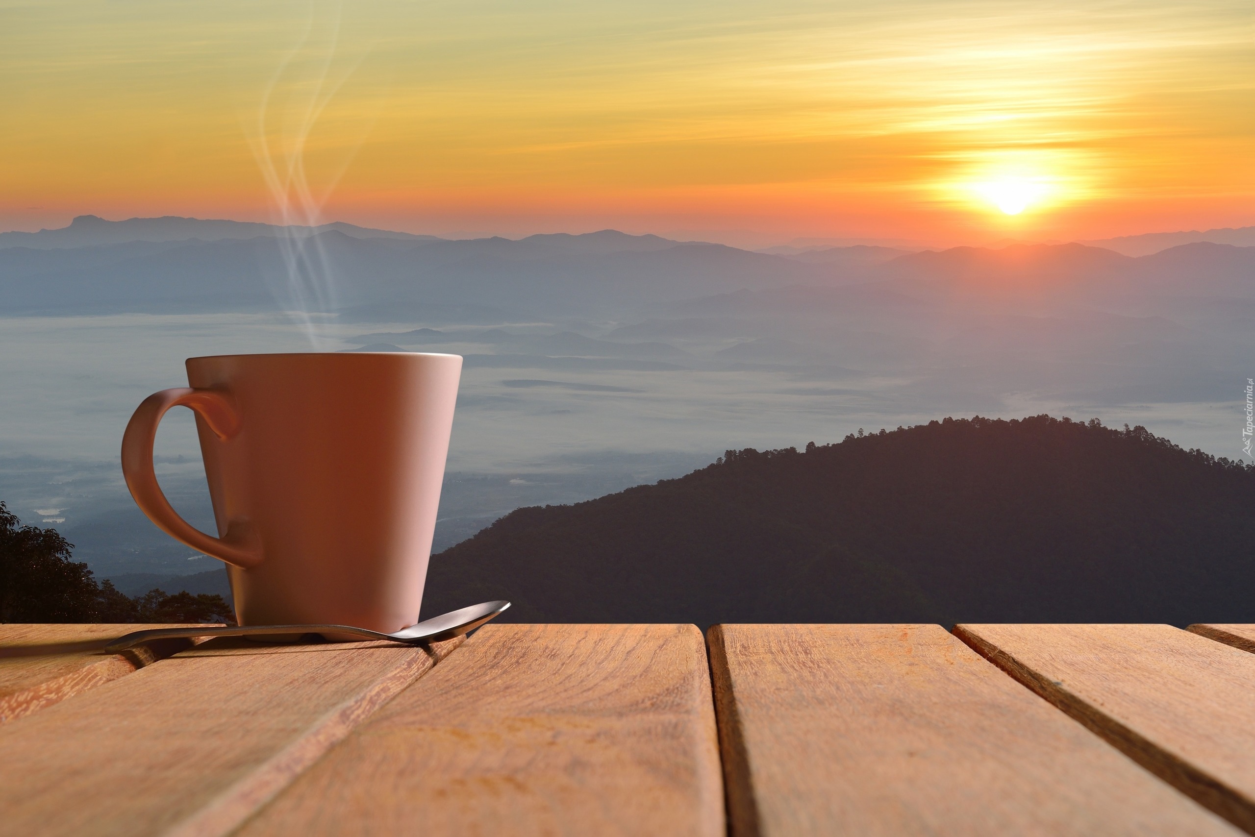 Edytor tapety: Kubek z parującym napojem na tle krajobrazu