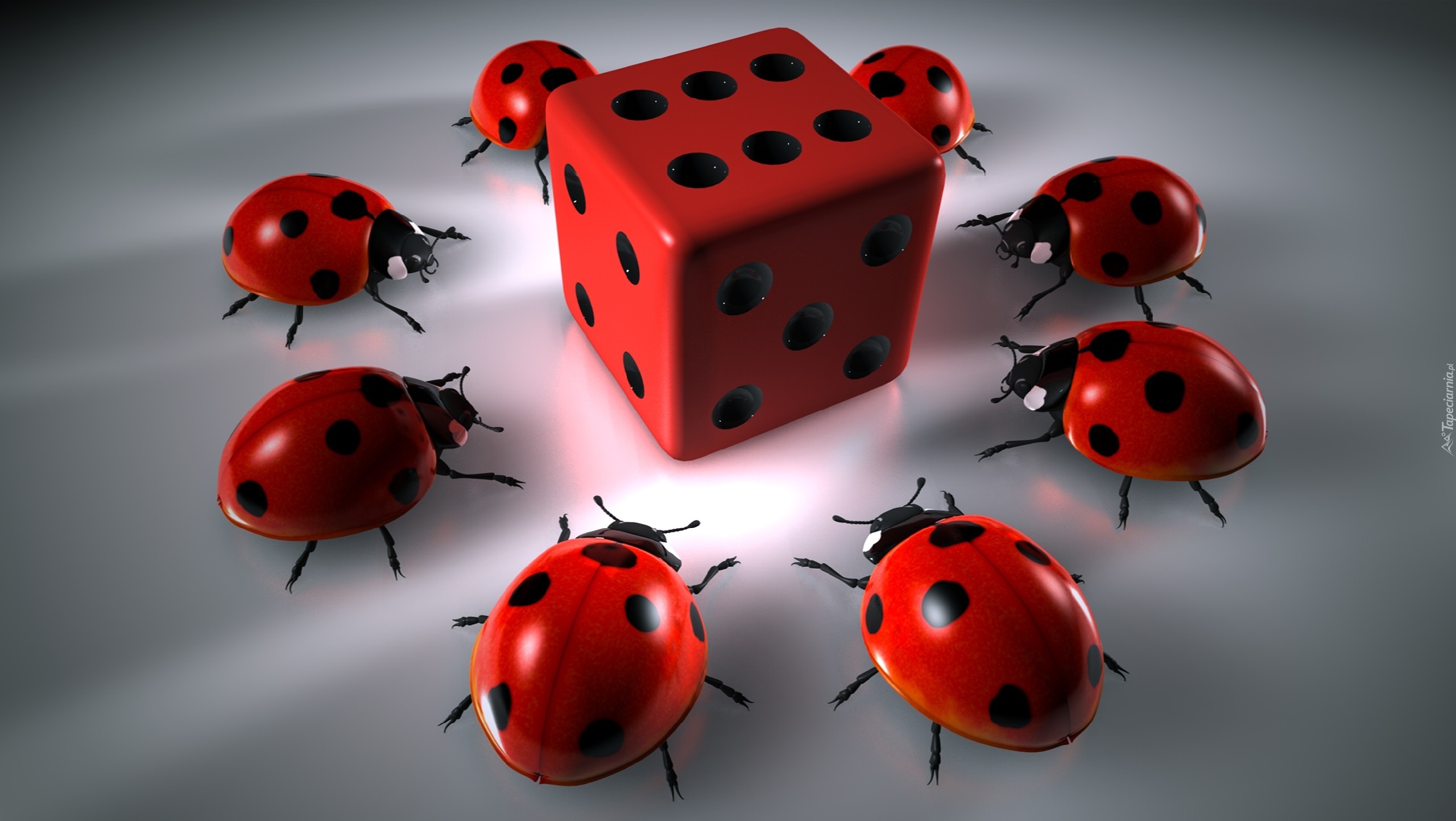 Edytor tapety: Biedronki dookoła kostki do gry w grafice 3D