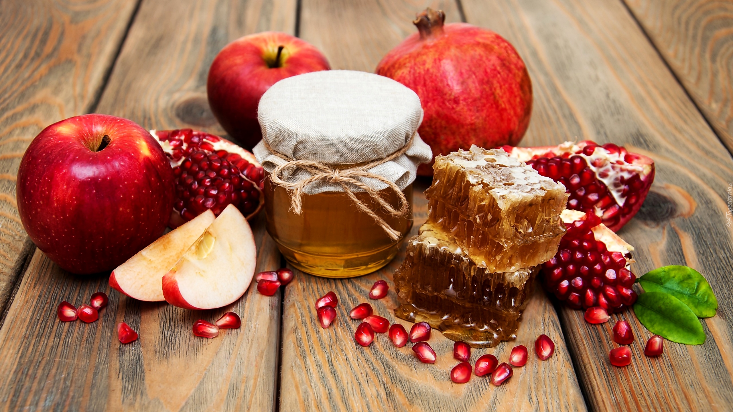 Edytor tapety: Kawałki granatu i jabłka obok słoika z miodem