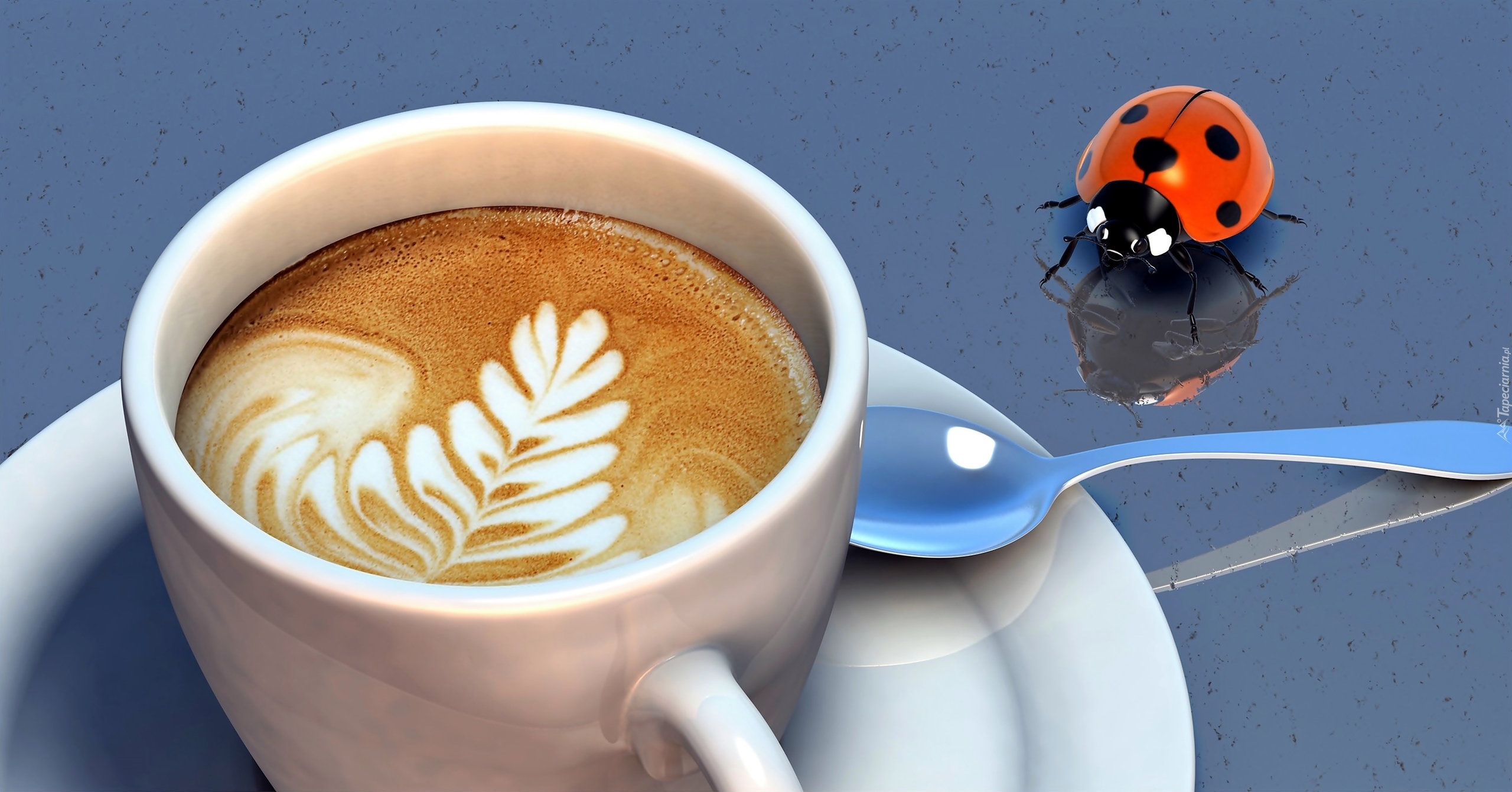Edytor tapety: Biedronka na blacie obok filiżanki z kawą