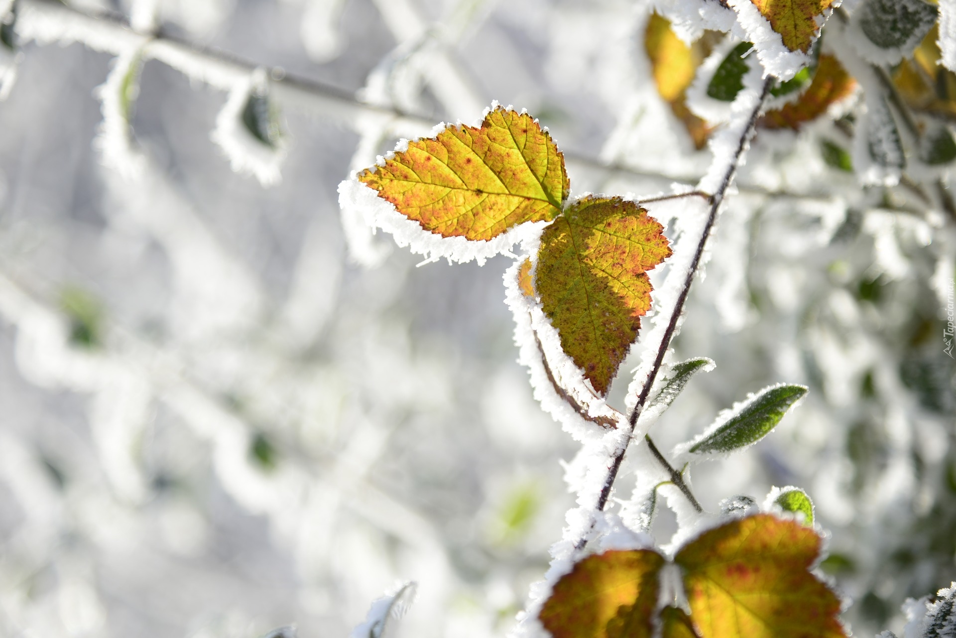 Edytor tapety: Pożółkłe liście na oszronionej gałązce