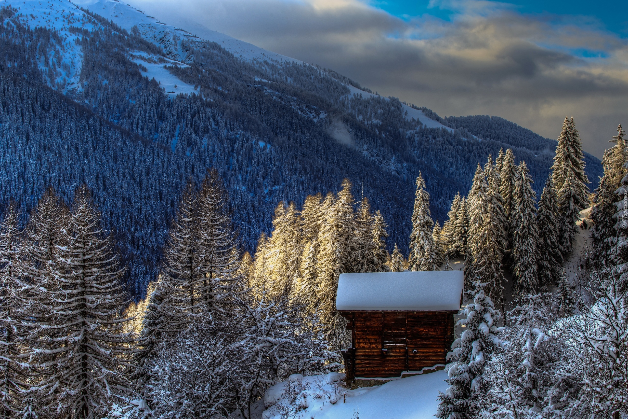 Edytor tapety: Ośnieżony domek w górach
