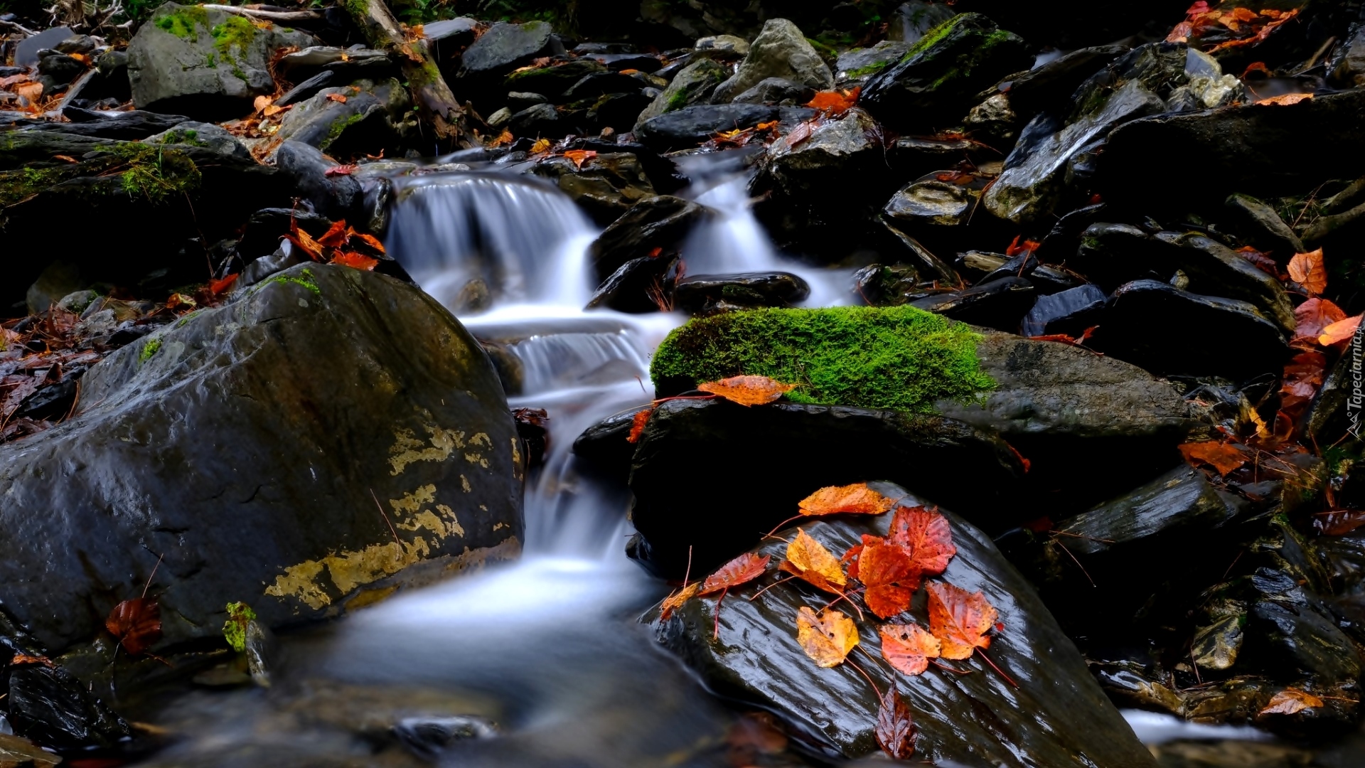 Edytor tapety: Kamienisty strumień w liściach