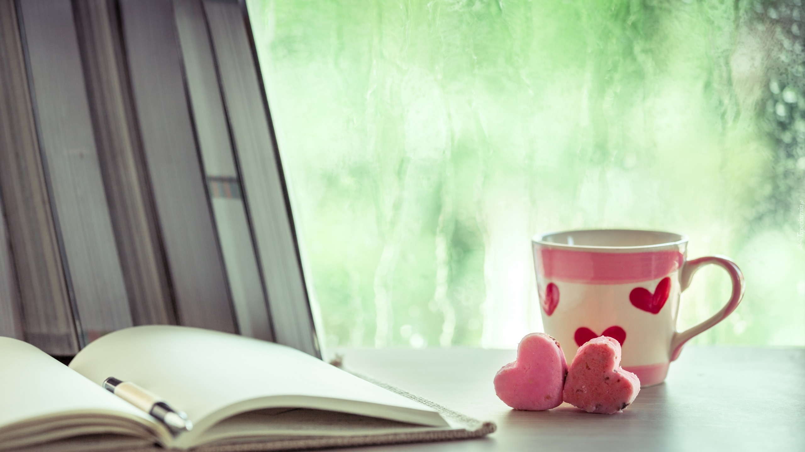 Edytor tapety: Kubek i ciastka serduszka obok zeszytu przy oknie