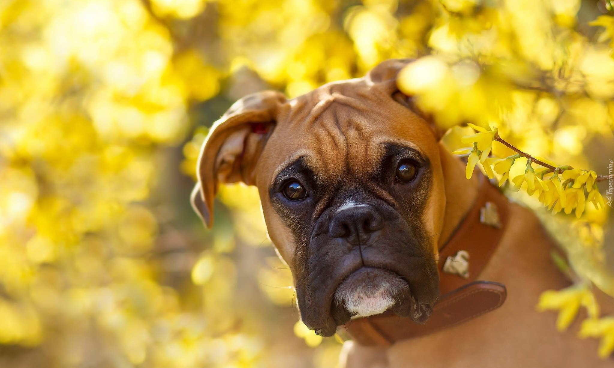 Edytor tapety: Bokser wśród forsycji
