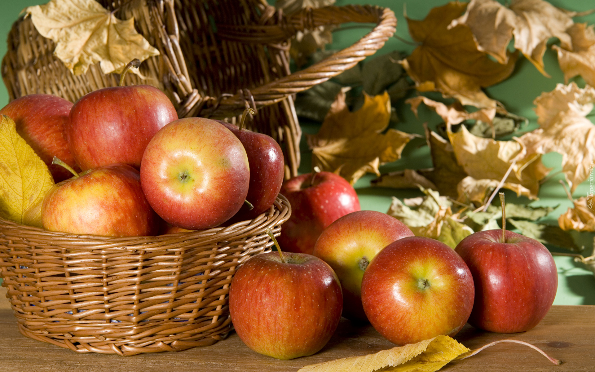 Edytor tapety: Koszyk z jabłkami i suche liście jesienne