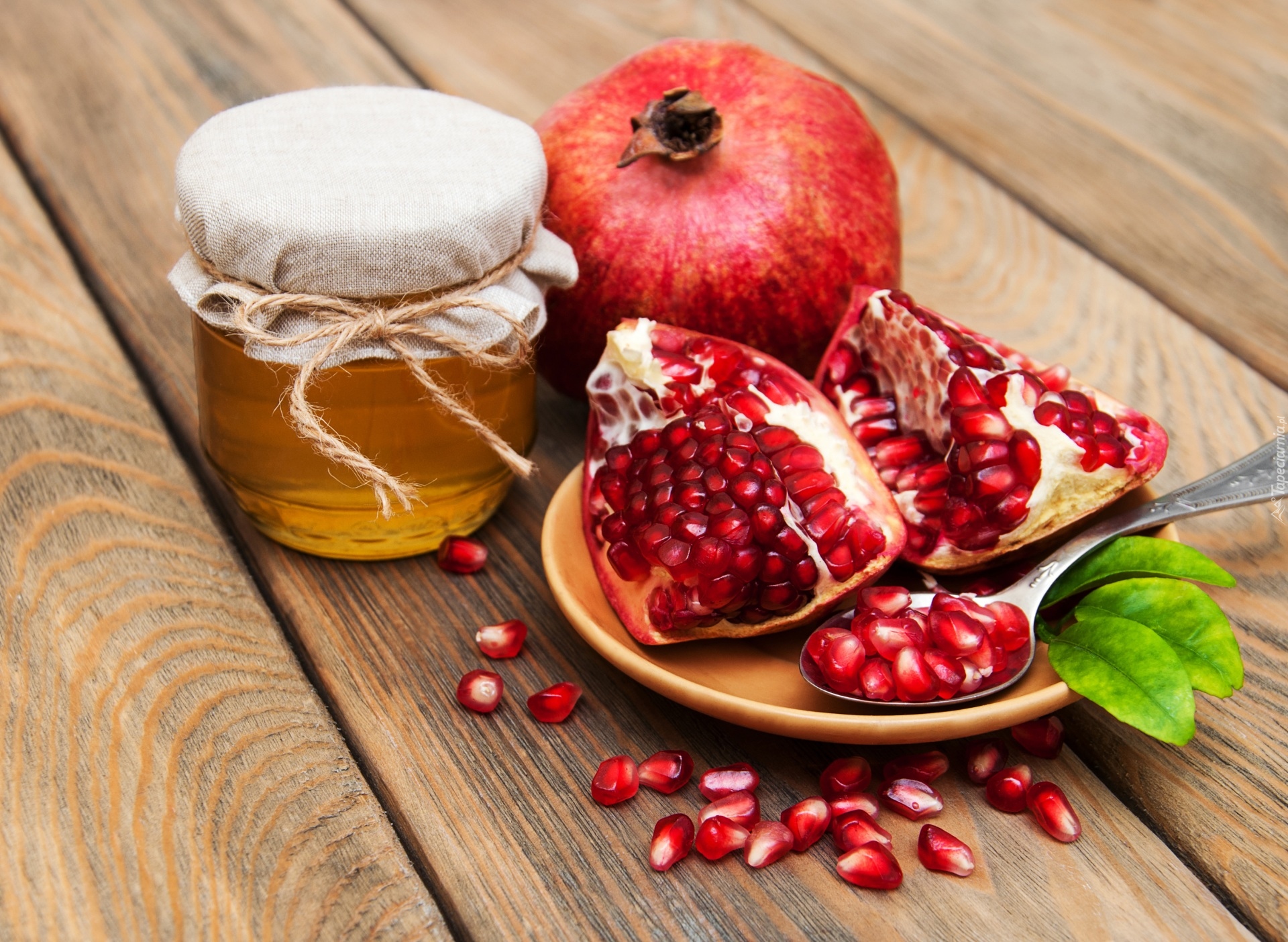 Edytor tapety: Owoce granatu obok słoiczka miodu