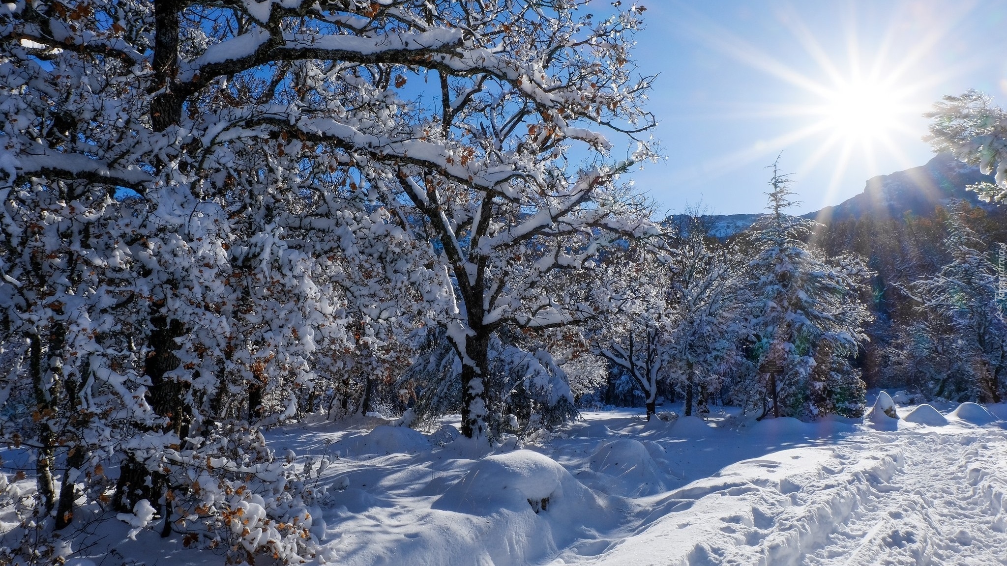 Edytor tapety: Zaśnieżony las ogrzewany promieniami słońca