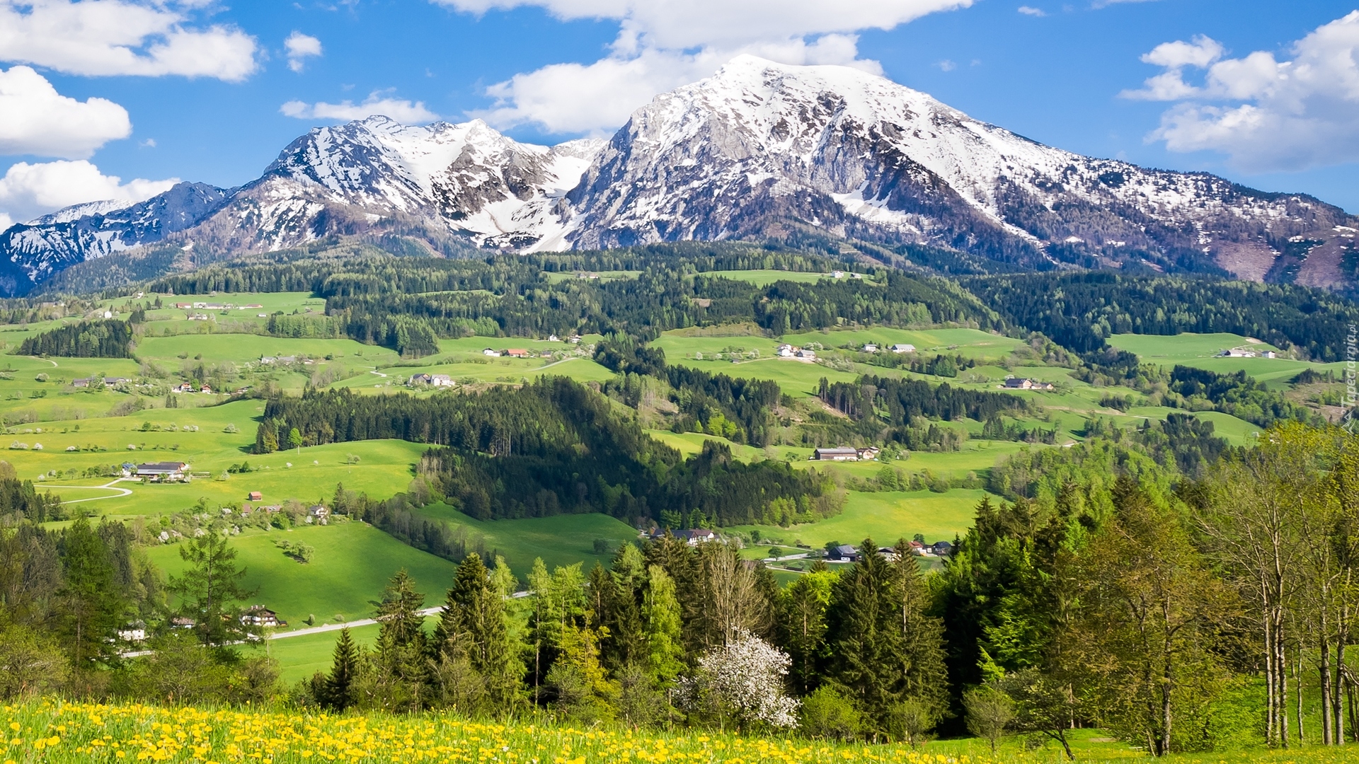 Edytor tapety: Domki w górach z widokiem na ośnieżone szczyty