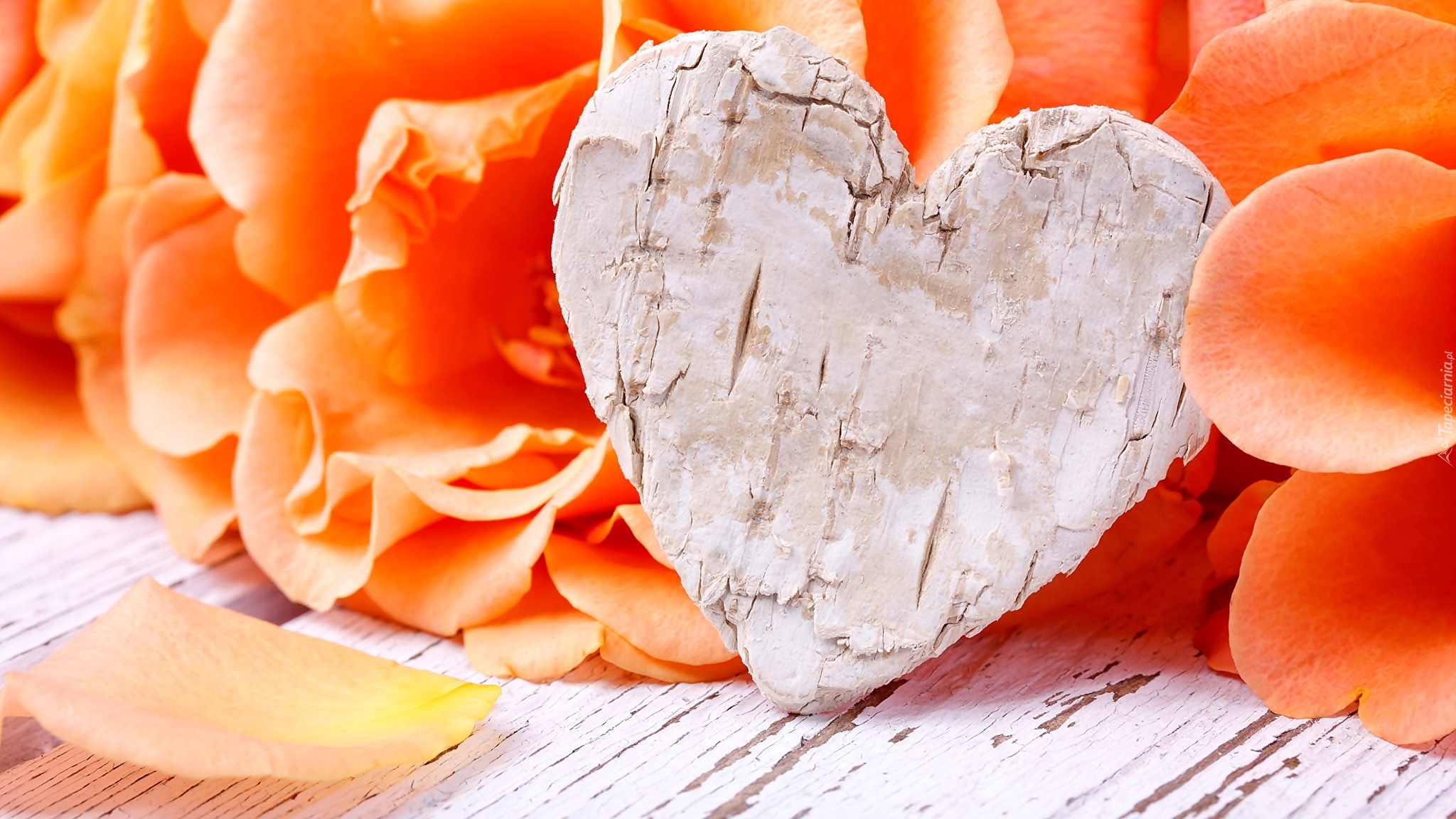 Edytor tapety: Drewniane serce na płatkach róż