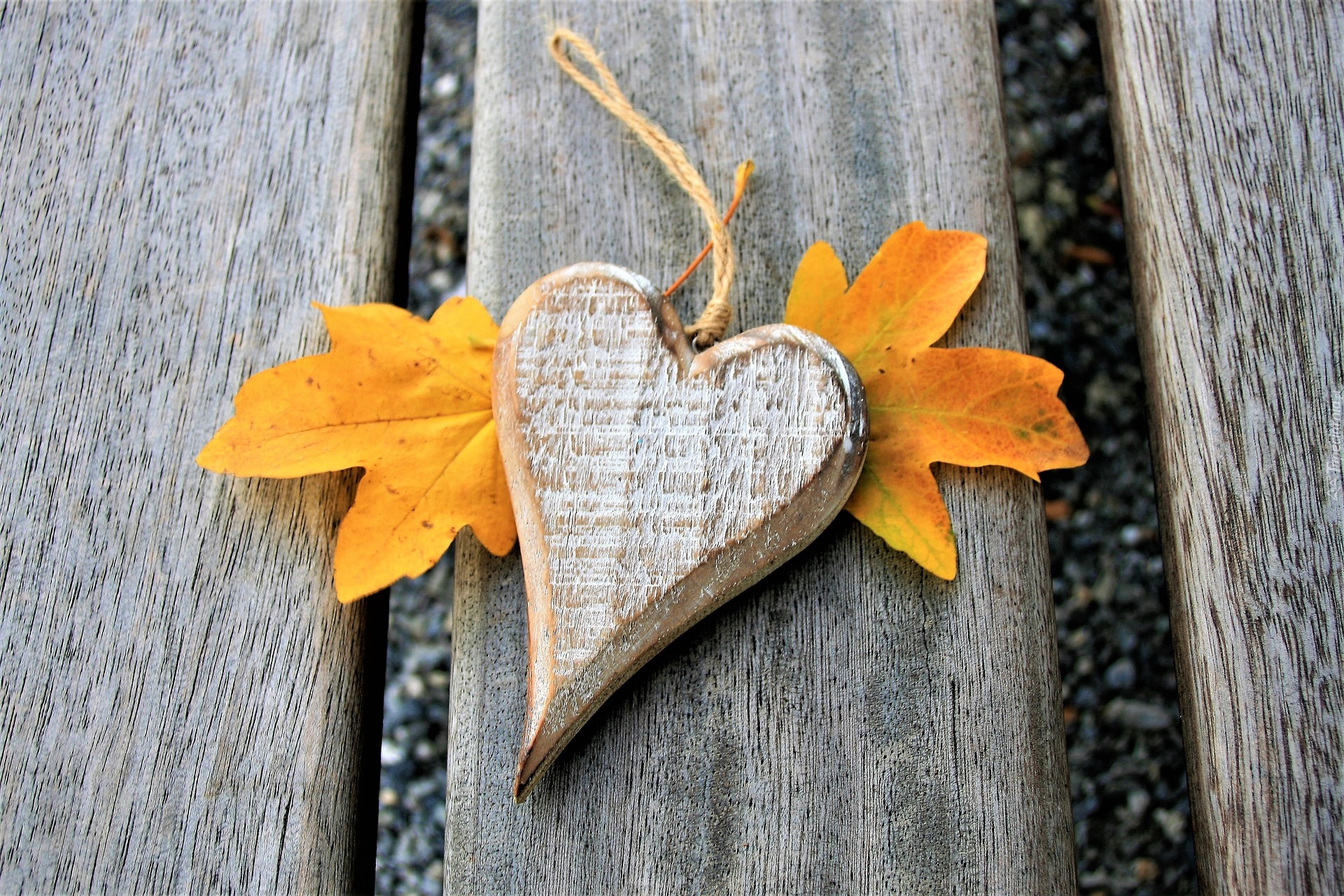 Edytor tapety: Drewniana zawieszka w kształcie serca na jesiennych liściach
