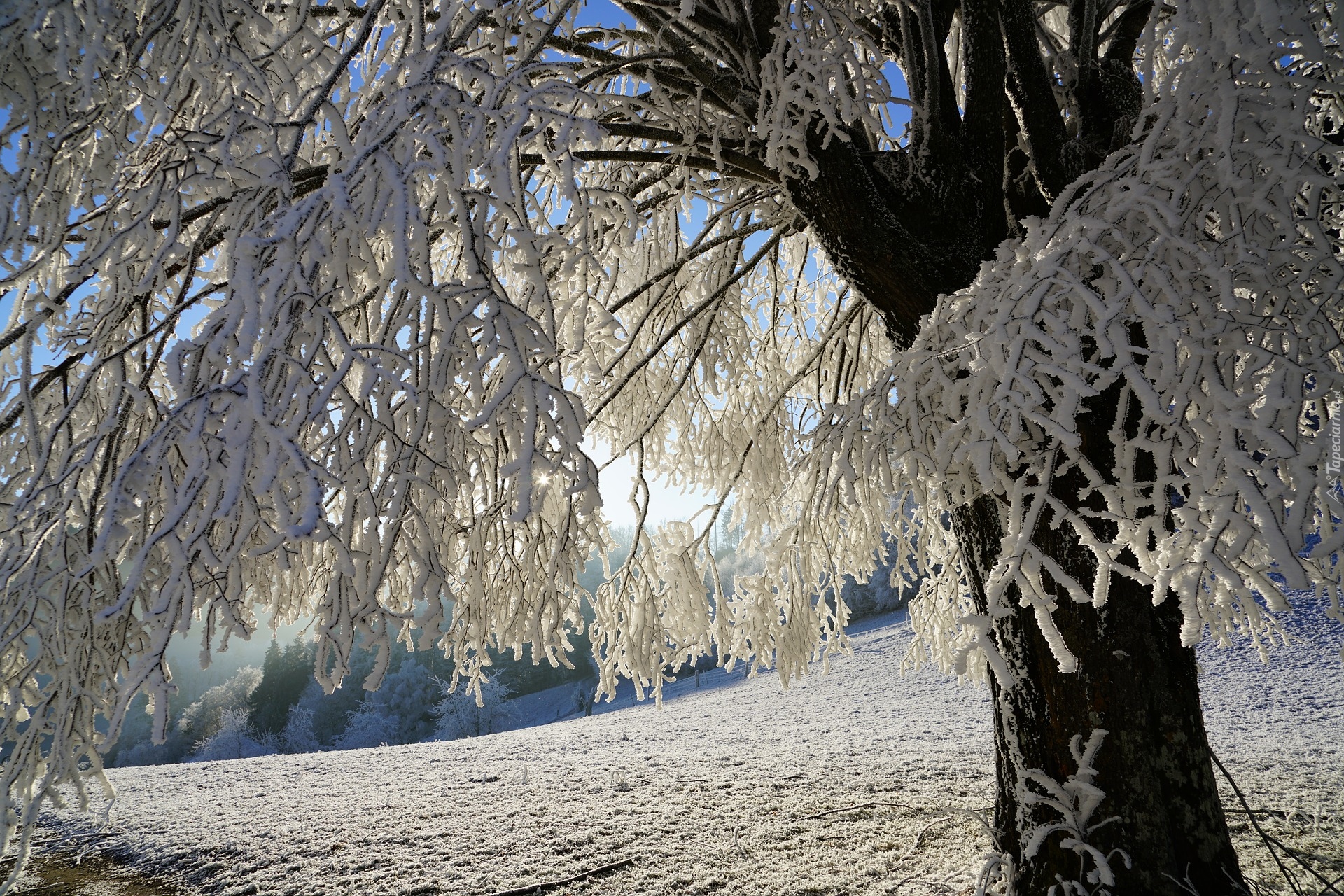 Edytor tapety: Śnieg na gałązkach drzewa w świetle słońca zimą