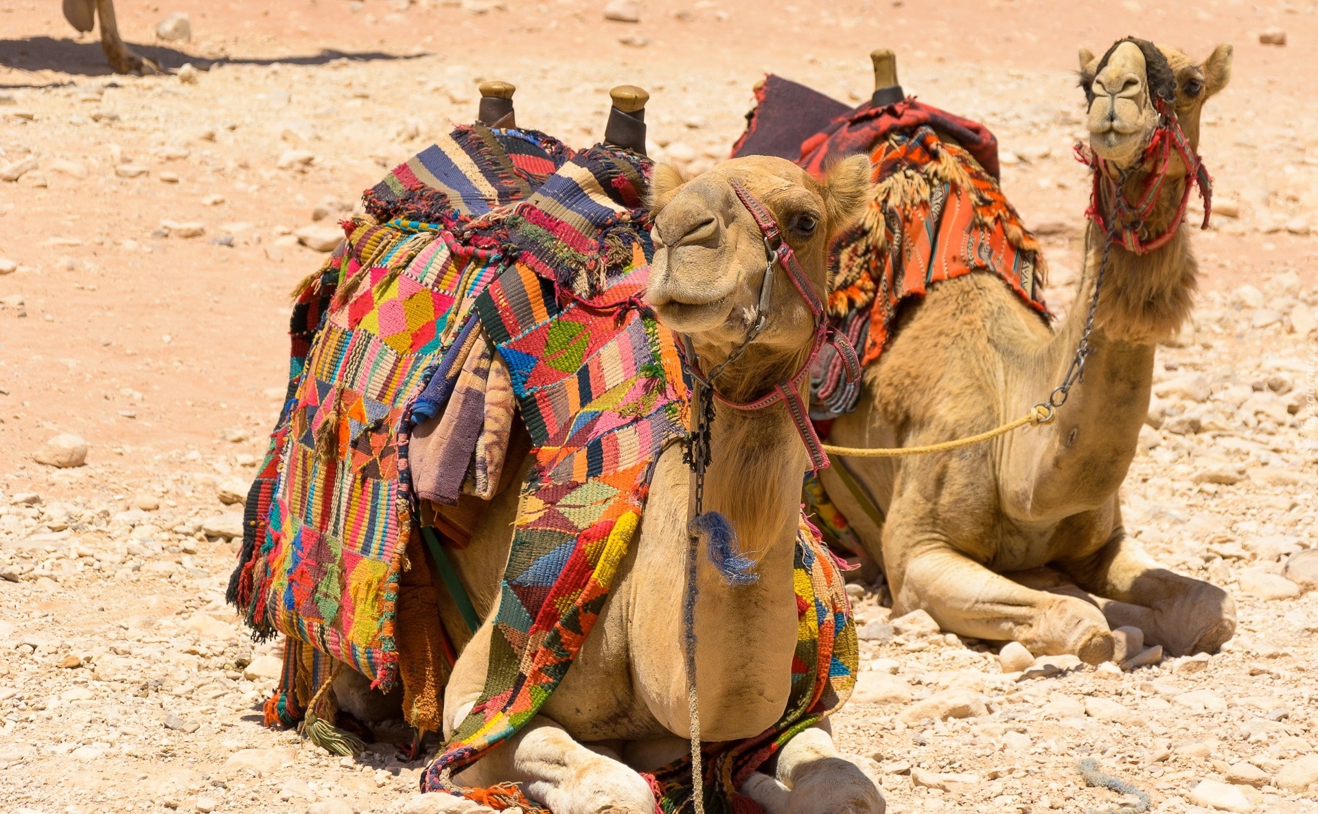 Edytor tapety: Dwa wielbłądy odpoczywają na piasku