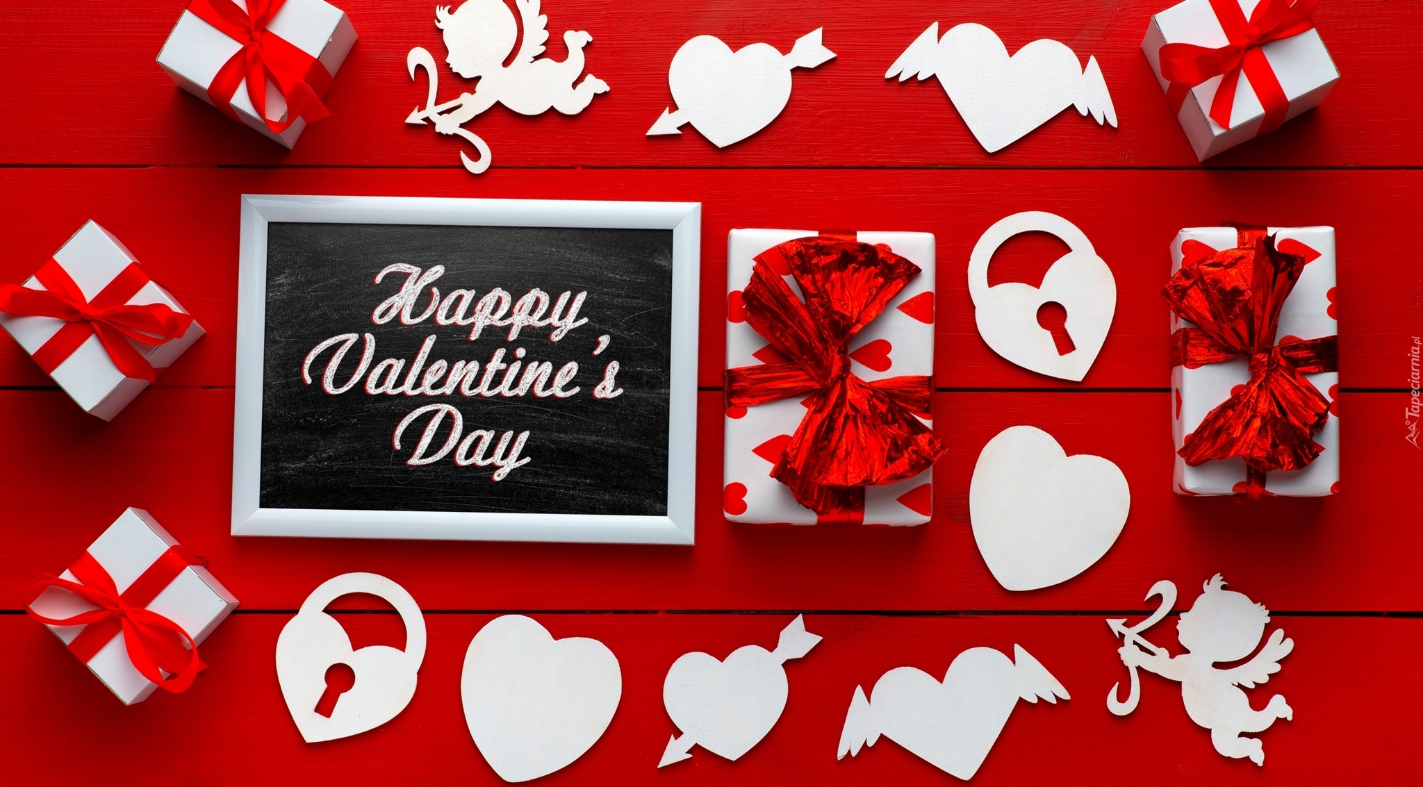 Edytor tapety: Walentynkowa kompozycja na czerwonych deskach