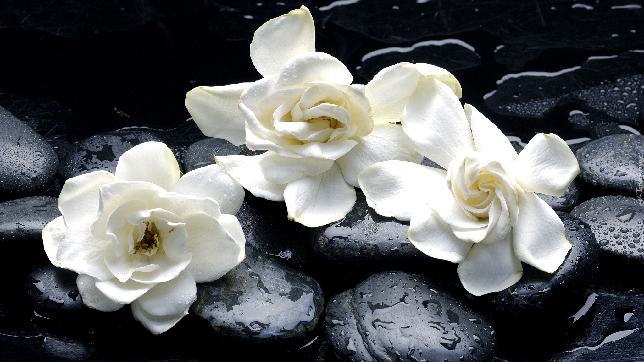 Edytor tapety: Trzy kwiaty gardenii na kamieniach