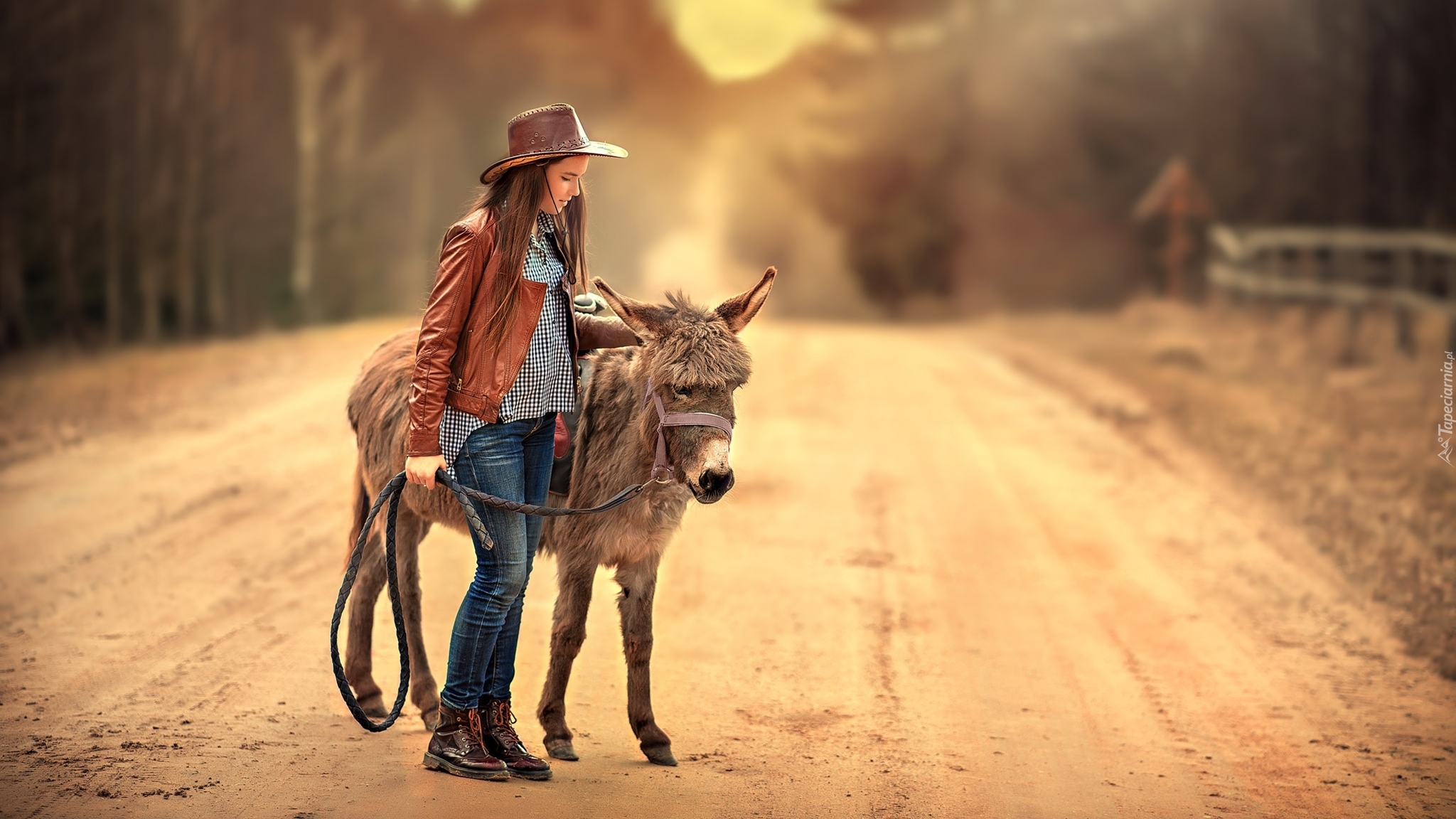 Edytor tapety: Dziewczyna z osiołkiem na drodze