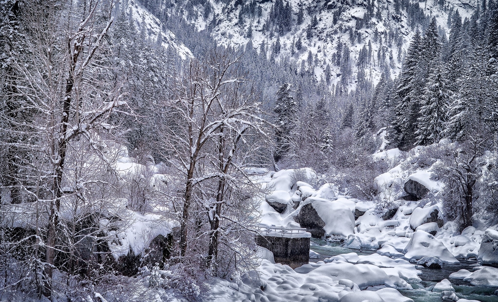 Edytor tapety: Ośnieżone drzewa i kamienie w strumyku