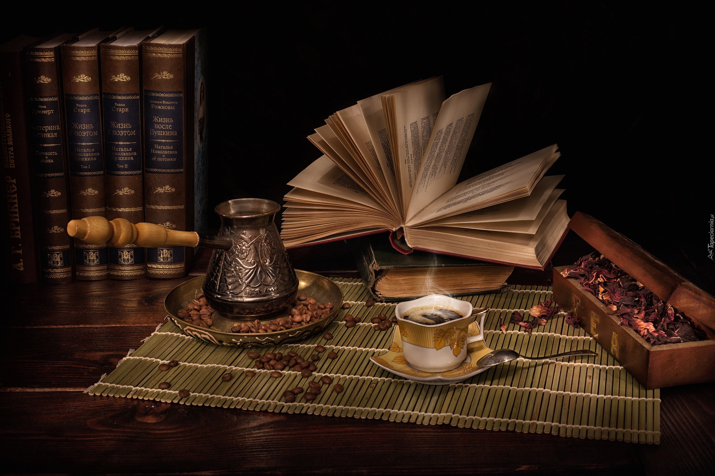 Edytor tapety: Tygielek i filiżanka kawy obok książek