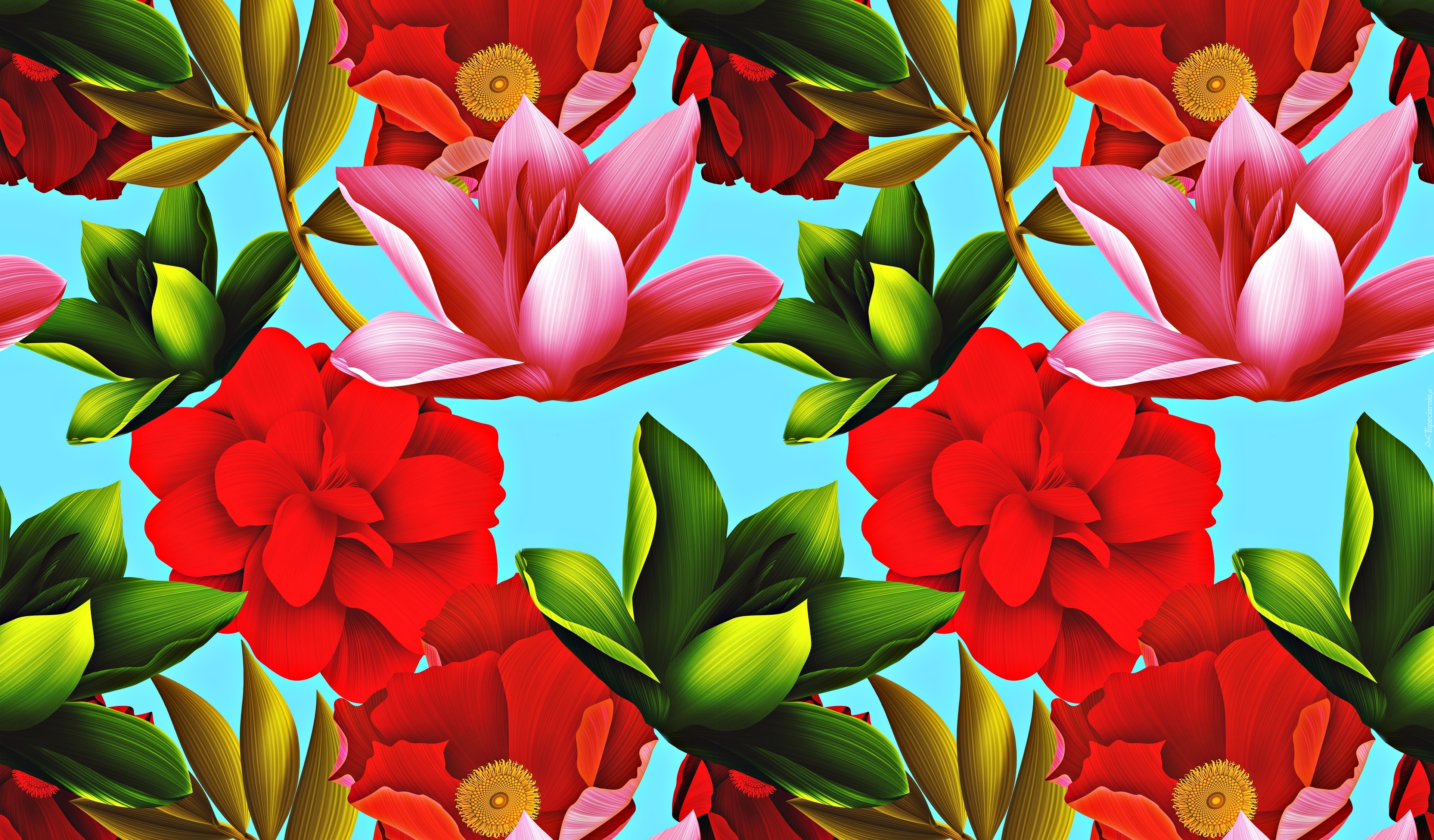 Edytor tapety: Kolorowe kwiaty w grafice na niebieskim tle