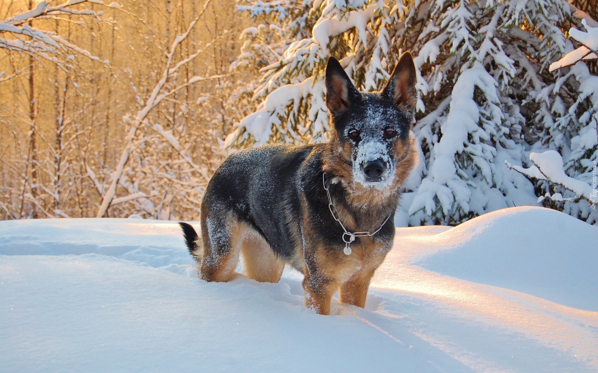 Edytor tapety: Owczarek niemiecki z mordką całą w śniegu
