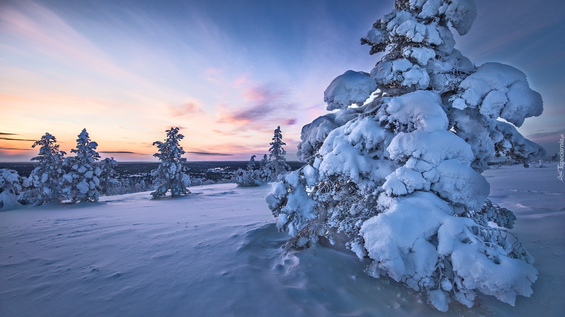 Edytor tapety: Świerki o zachodzie słońca zimową porą