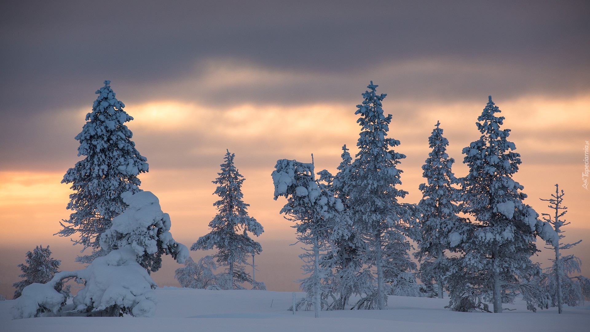 Edytor tapety: Świerki w śniegu o zachodzie słońca