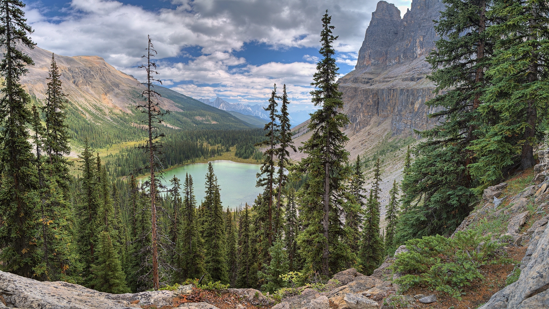 Edytor tapety: Drzewa wokół górskiego jeziora