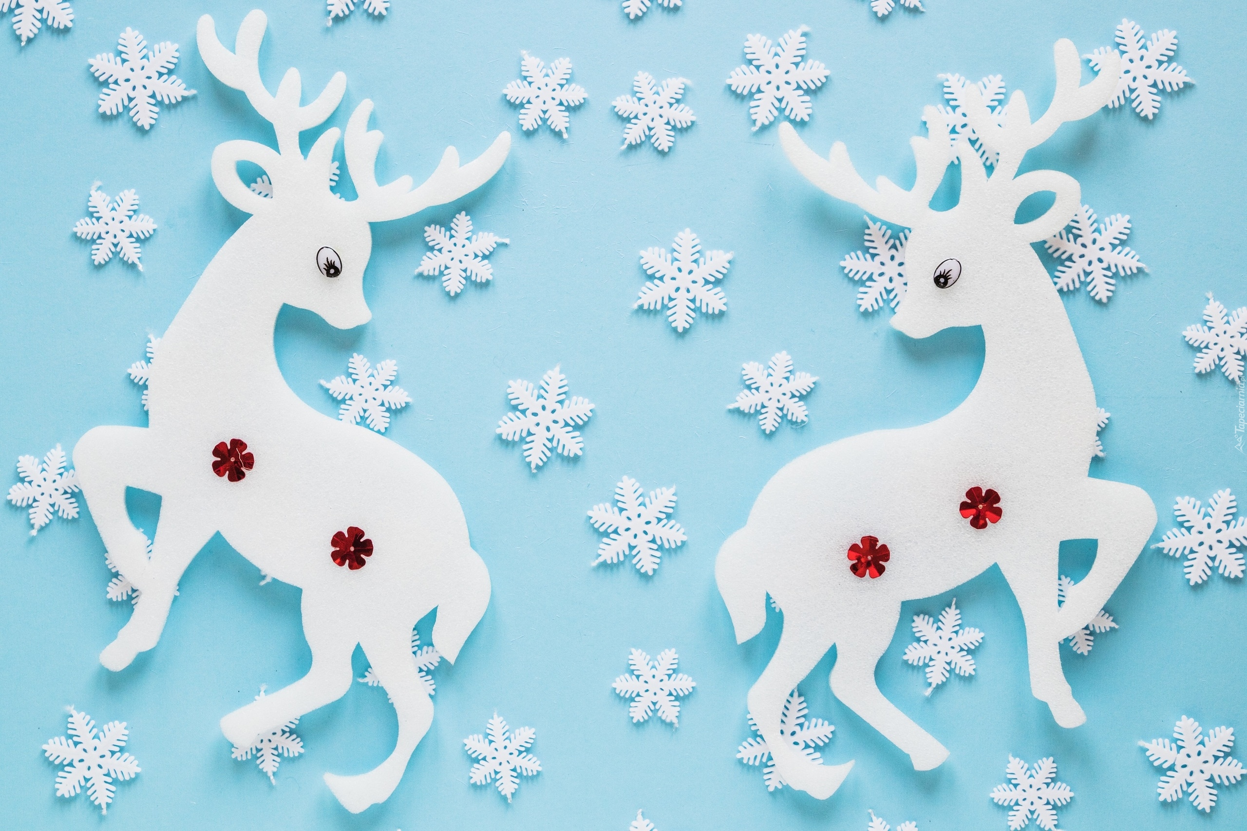 Edytor tapety: Dwa białe renifery i śnieżynki na niebieskim tle