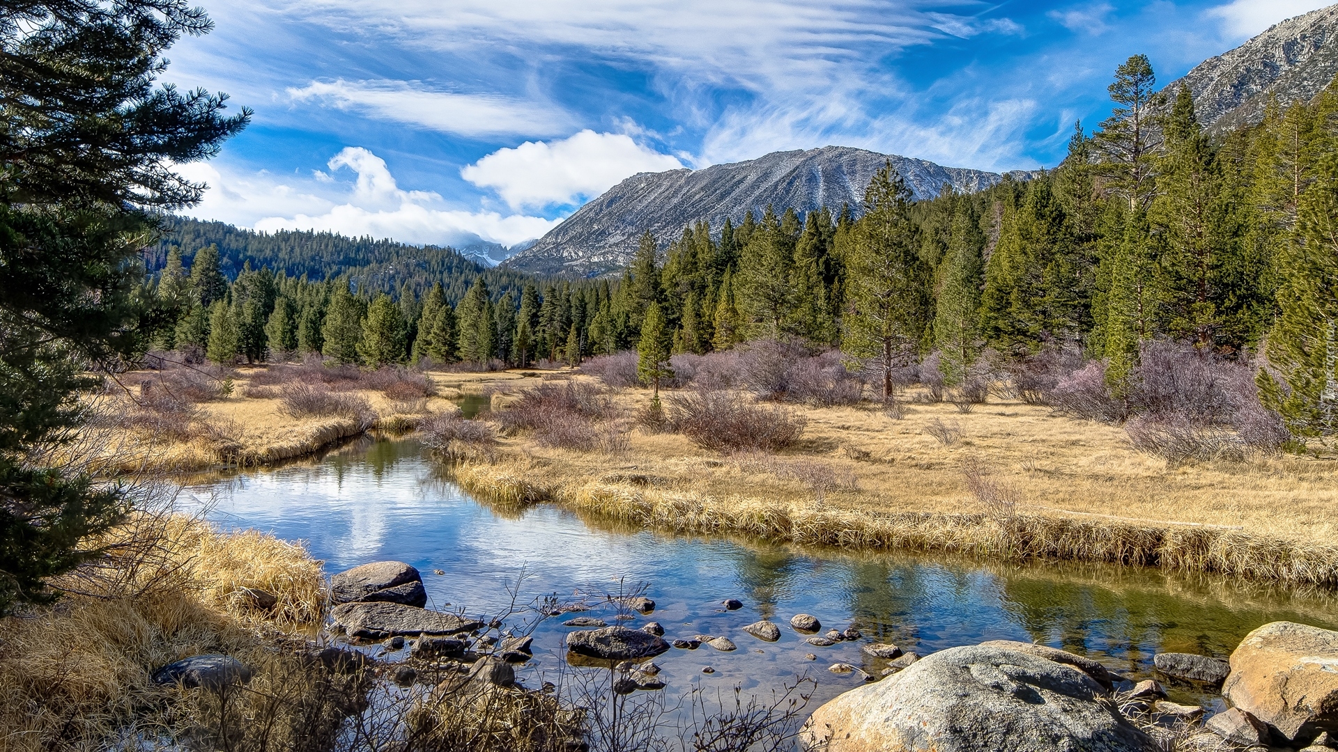 Edytor tapety: Rzeczka w lesie z górami w tle