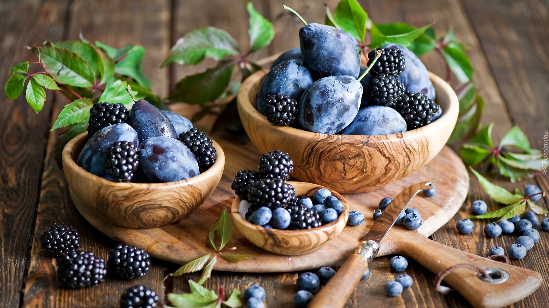 Edytor tapety: Śliwki i jeżyny w drewnianych miseczkach na desce