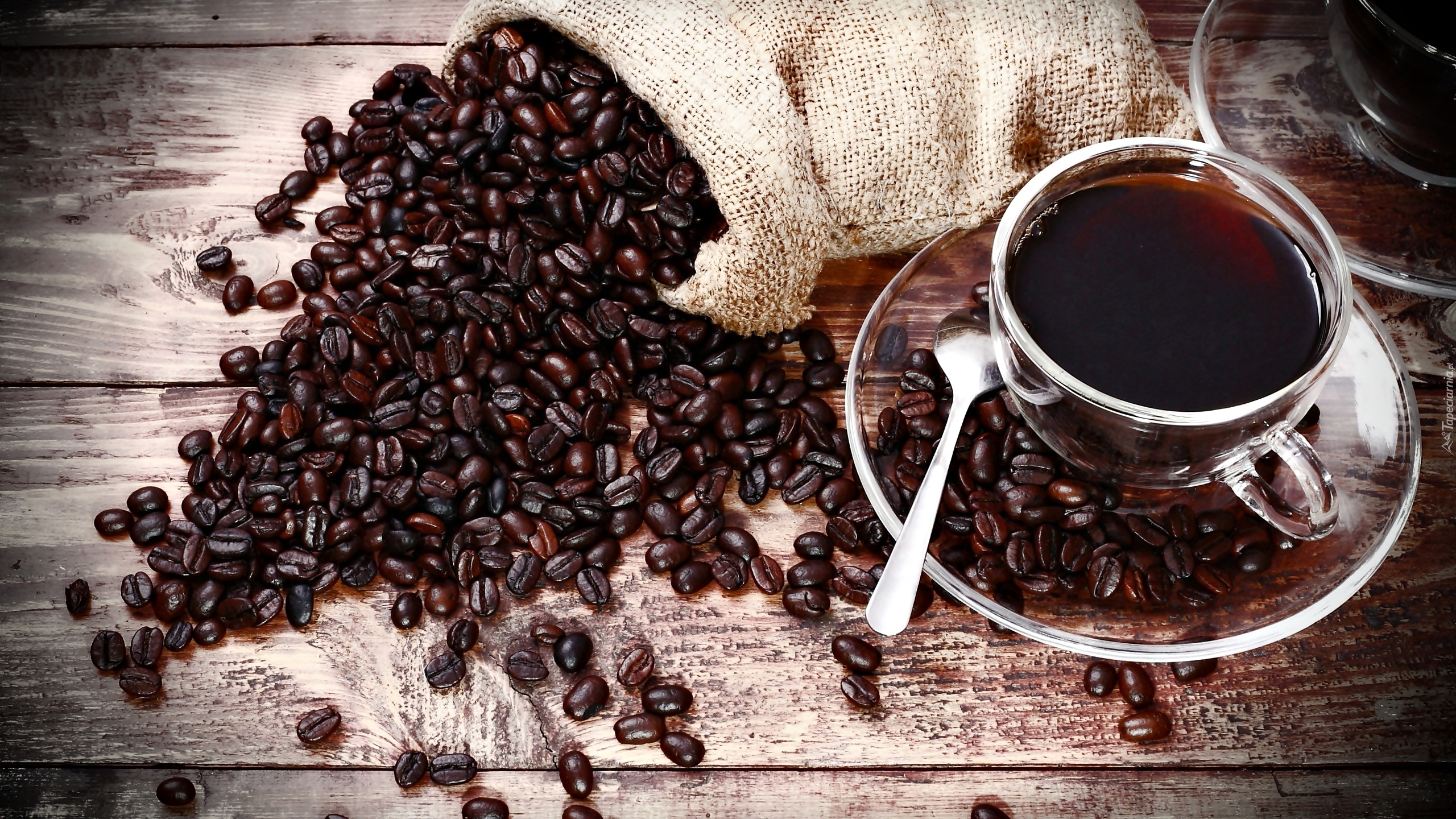 Edytor tapety: Filiżanka kawy obok worka z wysypującymi się ziarnami
