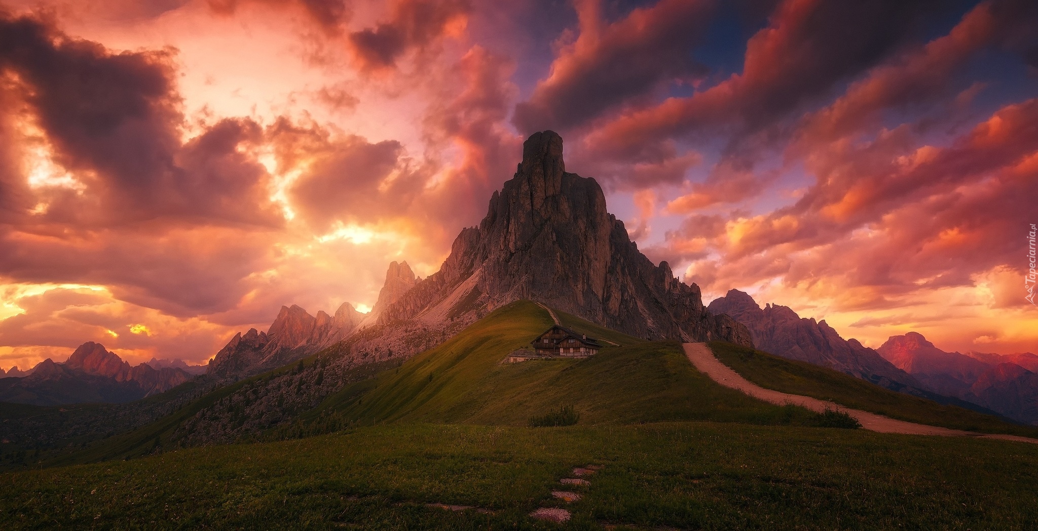 Edytor tapety: Domek w górach o zachodzie słońca