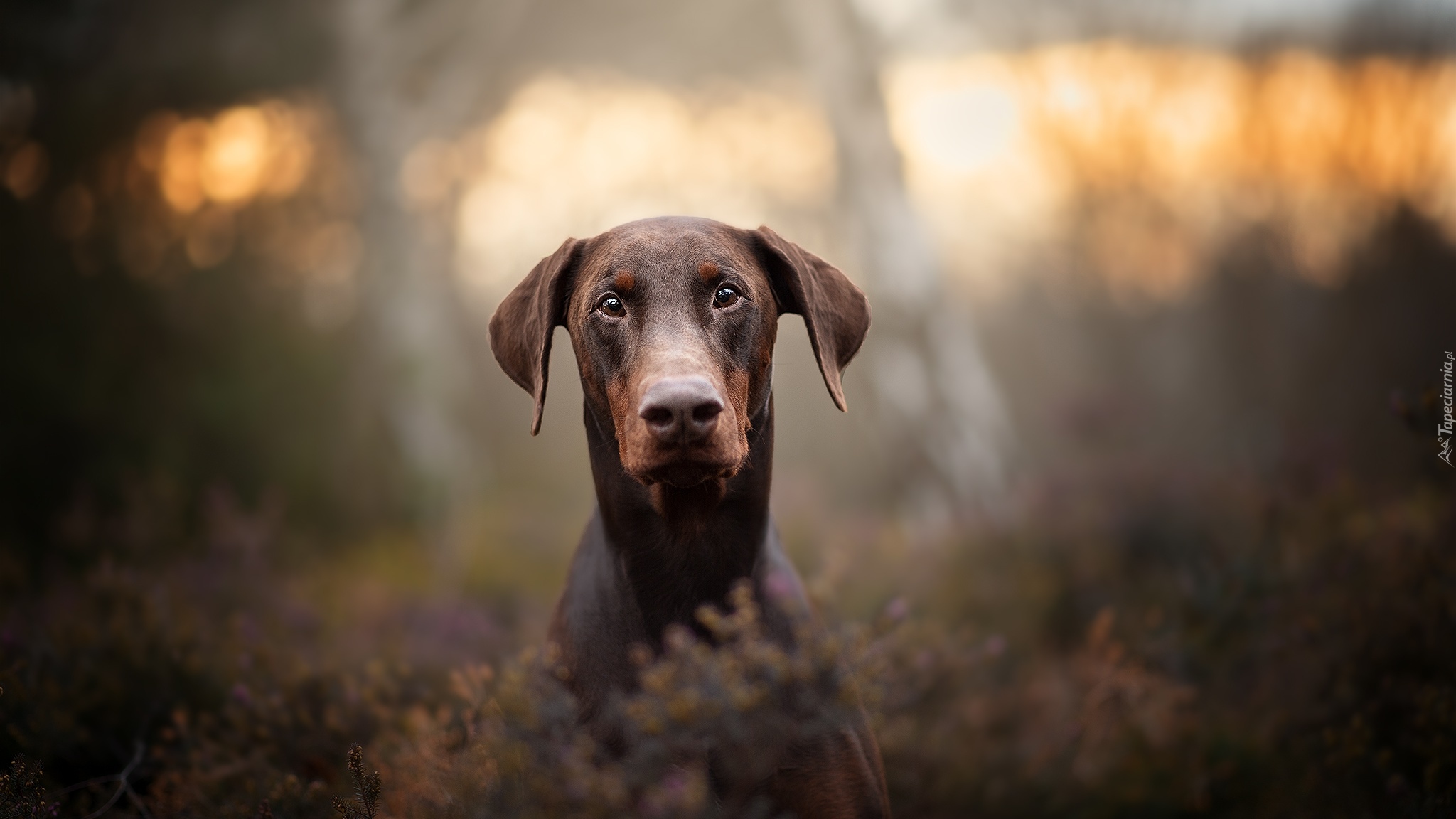 Edytor tapety: Mordka dobermana we wrzosach